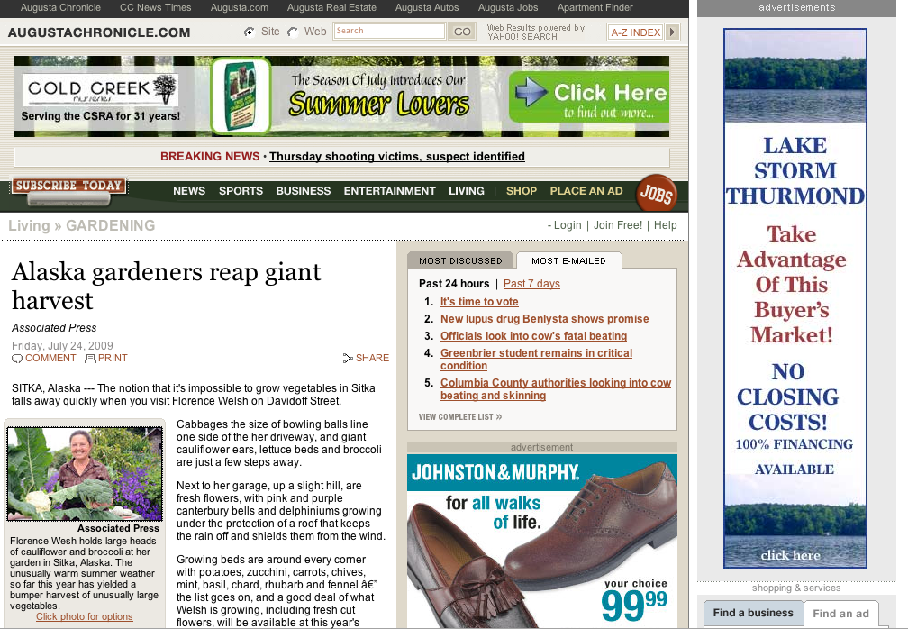 A screenshot from the Augusta Chronicle Web site showing a story and photo about the Sitka Farmers Market. The story originally appeared in the July 17 issue of the Daily Sitka Sentinel, and the Associated Press picked up the story for its wire, which is where the Augusta Chronicle got the story.