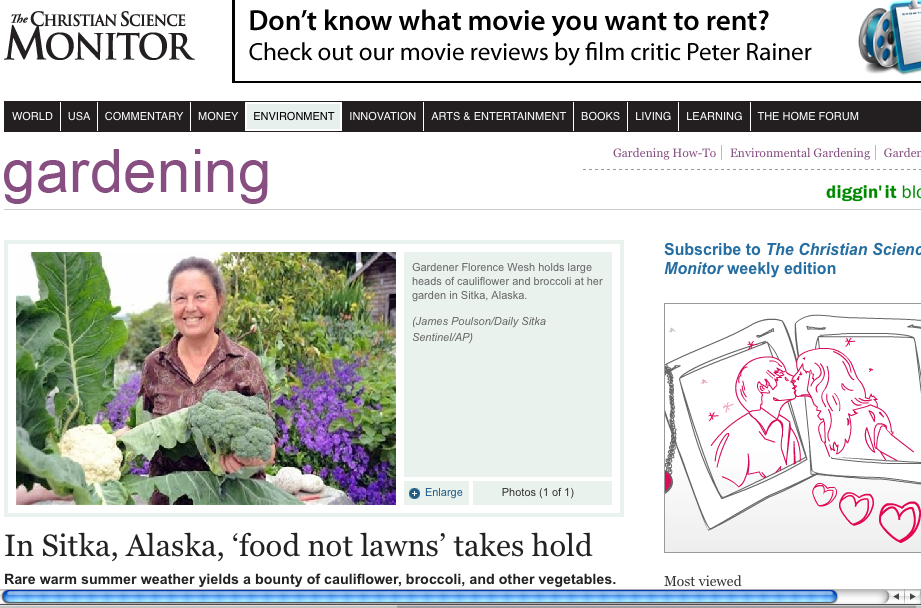 Picture 1 Published August 6, 2009 at 921 × 608 in • Sitka Local Foods Network featured in Christian Science Monitor A screenshot of the Christian Science Monitor site showing the Sitka Local Foods Network story A screenshot of the Christian Science Monitor site showing the Sitka Local Foods Network story