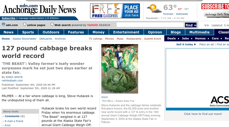 Picture 1 Published September 5, 2009 at 920 × 513 in • Another record cabbage at the Alaska State Fair Next → Screenshot of the Anchorage Daily News article on Steve Hubacek’s giant cabbage Screenshot of the Anchorage Daily News article on Steve Hubacek’s giant cabbage