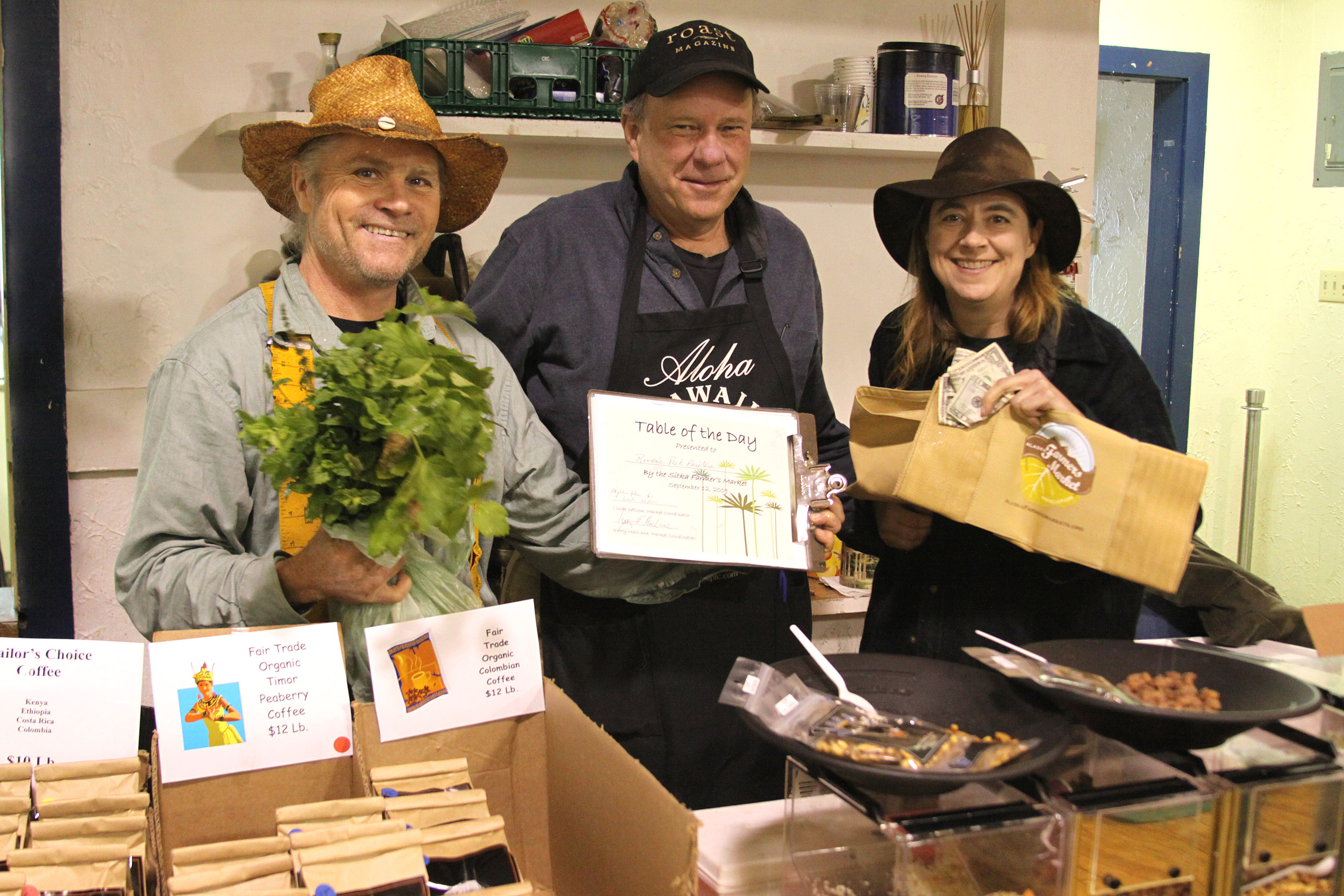 Mike Wise, center, of Raven’s Peek Roasters and Sailor’s Choice Coffee receives the Table of the Day Award from Kerry MacLane, left, and Linda Wilson, right, during the fifth and final Sitka Farmers Market of the 2009 summer on Sept. 12.