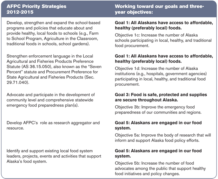 The Alaska Food Policy Council recently released its 2012-15 Alaska Food Policy Strategic Plan, which was about a year in development.