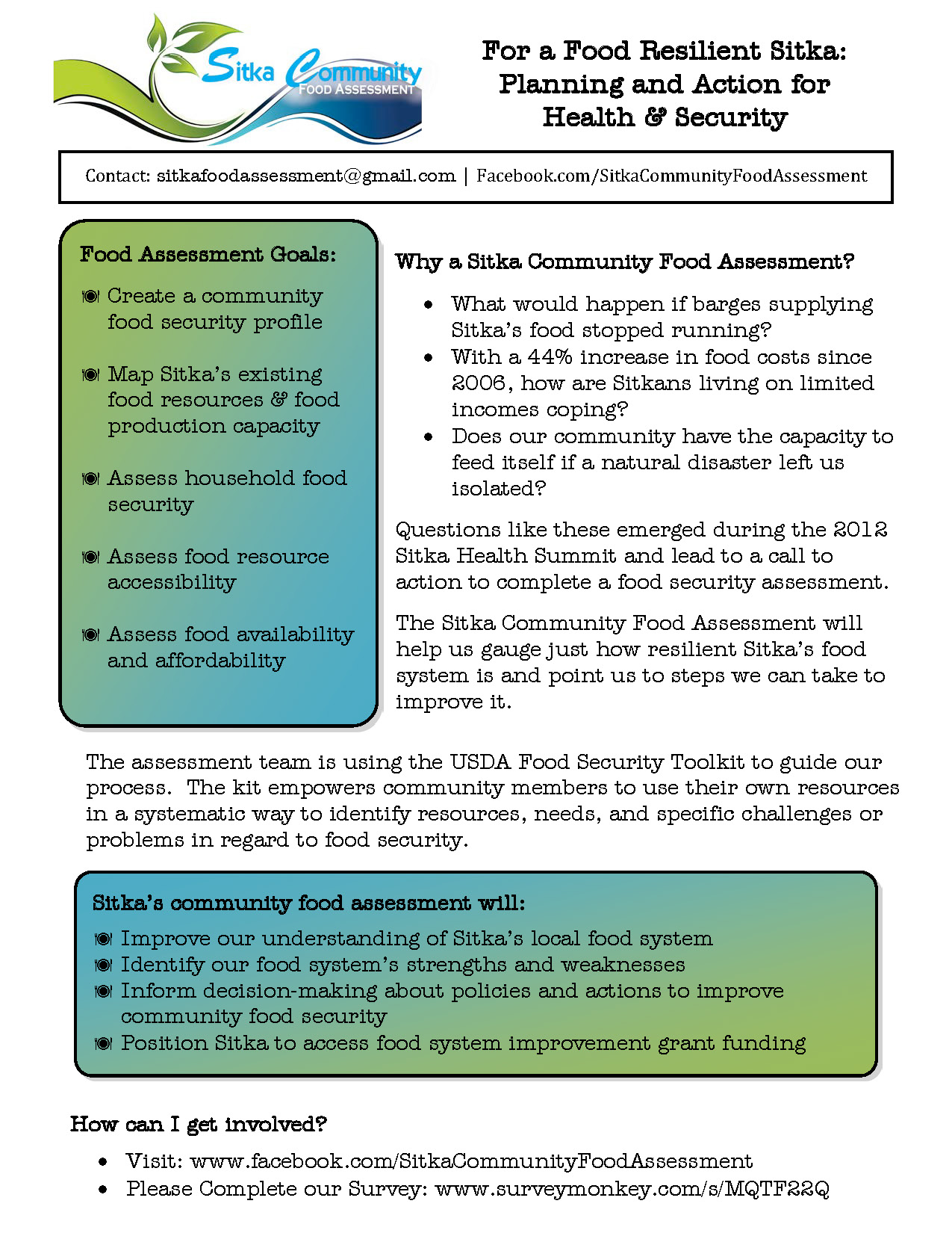 A link to the survey can be found on the Sitka Community Food Assessment page on Facebook (https://www.facebook.com/SitkaCommunityFoodAssessment), or by going directly to the survey at https://www.surveymonkey.com/s/MQTF22Q.