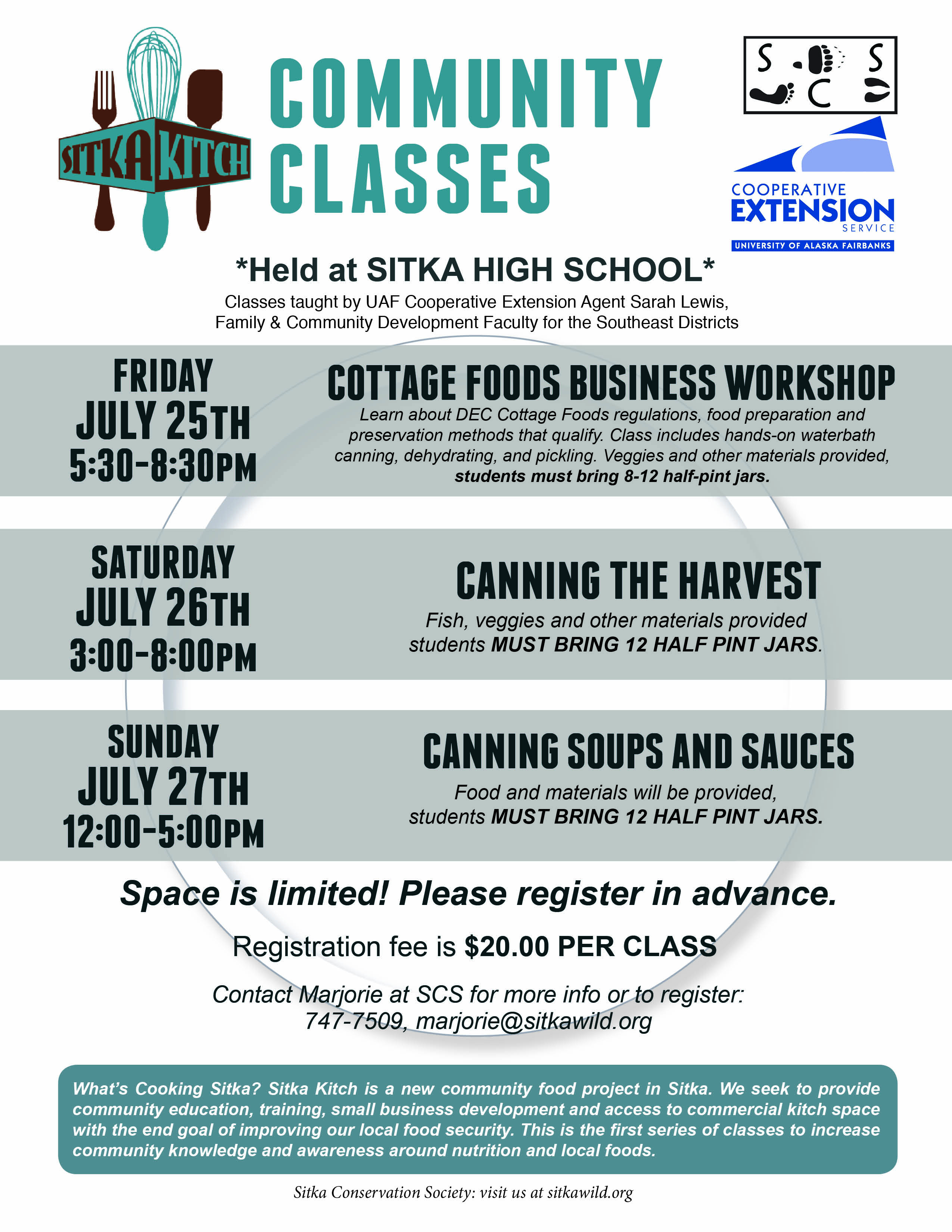 - Friday, June 25, 5:30-8:30 p.m., Cottage Foods Business Workshop — Students learn about Alaska Department of Environmental Conservation cottage foods industry regulations, as well as the food preparation and food preservation techniques that qualify. Class includes hands-on water-bath canning, dehydrating and pickling instruction. Veggies and other materials will be provided. Students must bring 8-12 half-pint canning jars with lids.
