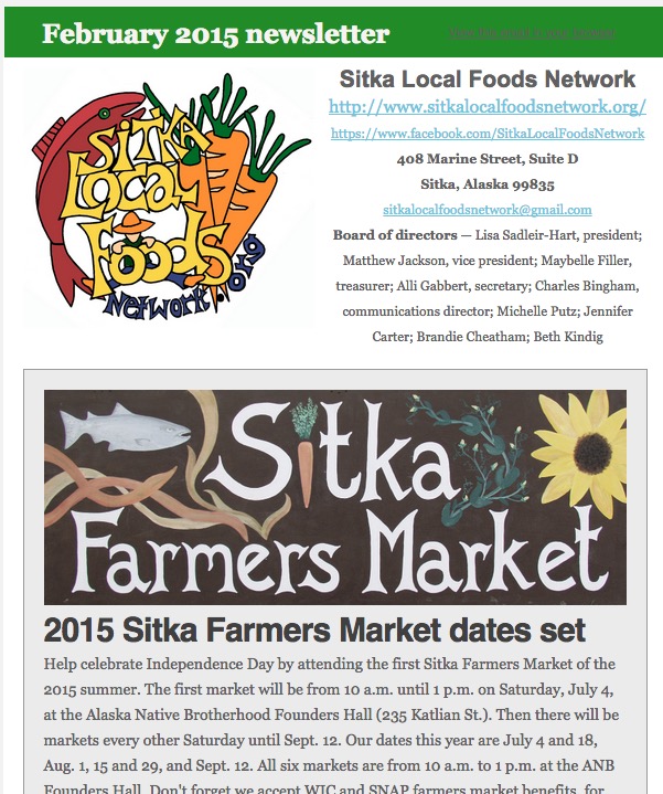 The Sitka Local Foods Network just sent out the February 2015 edition of its newly launched monthly newsletter. Feel free to click this link to get a copy.