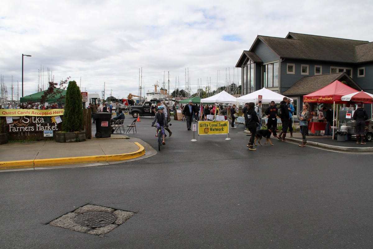 CrowdOutsideDarbyOsborneOnBike Published August 30, 2015 at 2700 × 1800 in • Scenes from the fifth Sitka Farmers Market of the 2015 summer, and the Sitka Slug Races ← Previous Next →