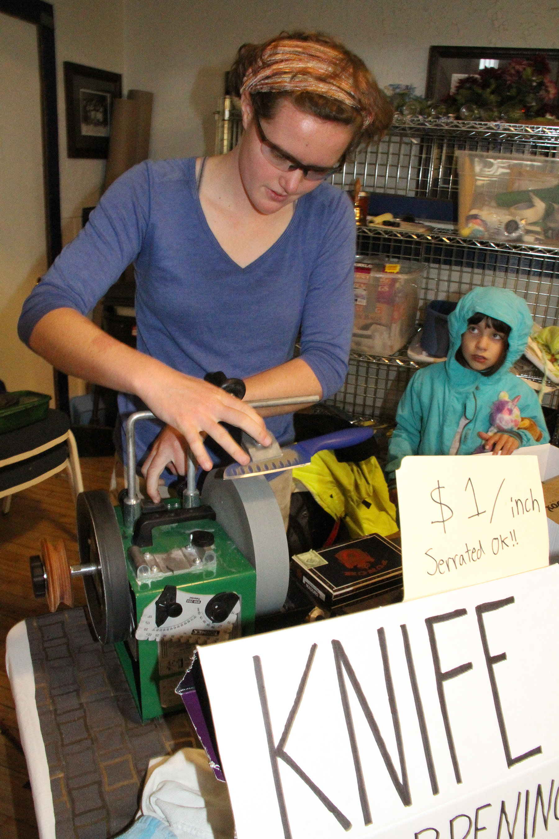 KidWatchesMaureenOHanlonPrepareToSharpenKnife Published August 30, 2015 at 1800 × 2700 in • Scenes from the fifth Sitka Farmers Market of the 2015 summer, and the Sitka Slug Races ← Previous Next →