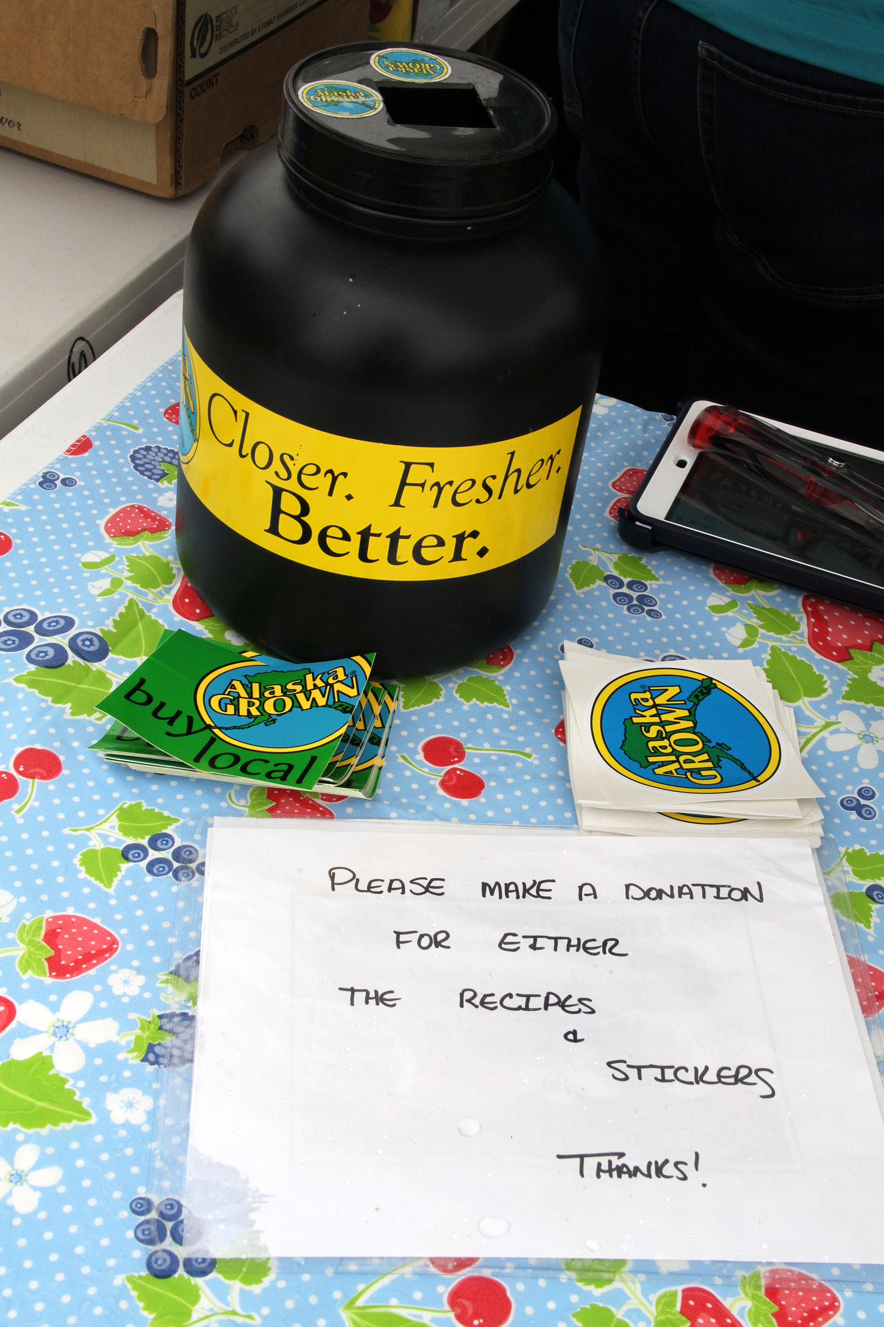 SLFNBoothDonationJar Published August 30, 2015 at 1800 × 2700 in • Scenes from the fifth Sitka Farmers Market of the 2015 summer, and the Sitka Slug Races ← Previous Next →
