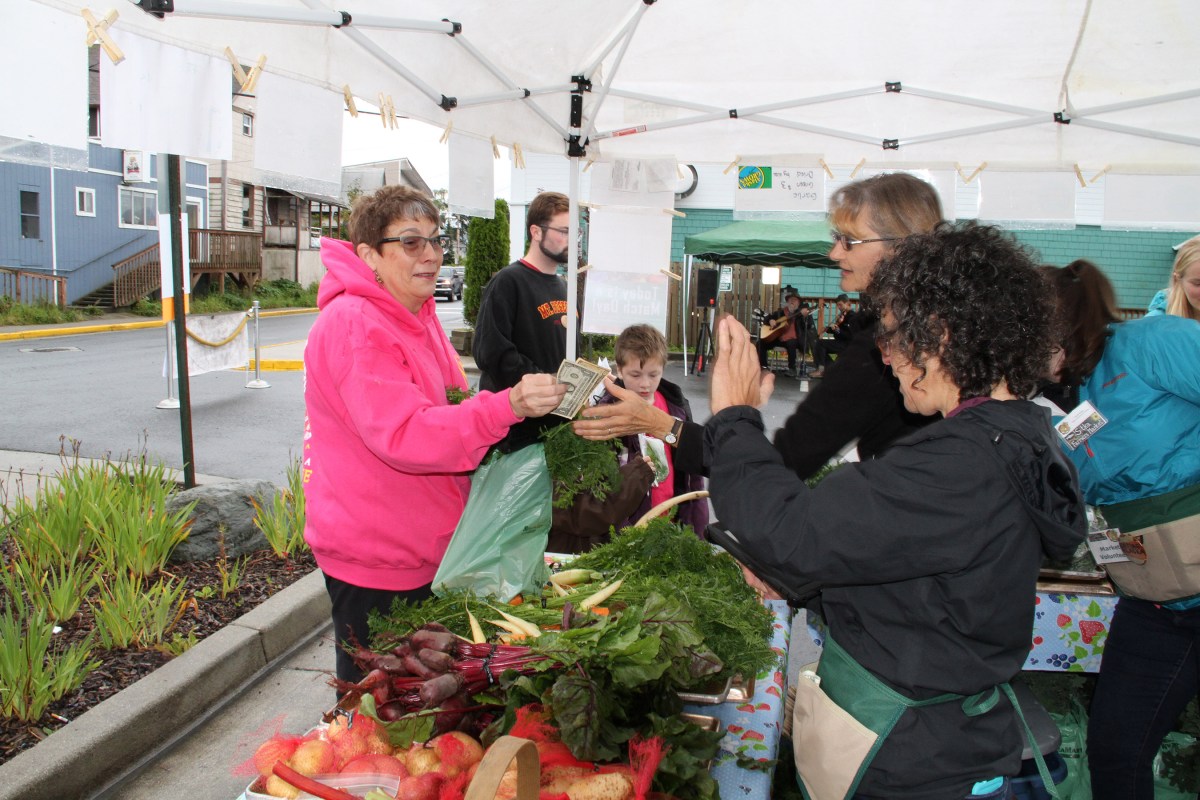 SLFNBoothJackieBarmoyBuysFromEllenFrankensteinAndBethKindig Published August 30, 2015 at 2700 × 1800 in • Scenes from the fifth Sitka Farmers Market of the 2015 summer, and the Sitka Slug Races ← Previous Next →