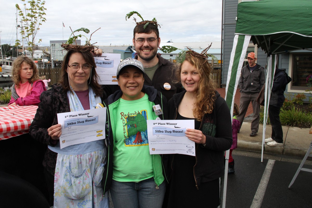 SlugRaceLindaWilsonAndMosesWinnersWithOtherTopFinishers Published August 30, 2015 at 2700 × 1800 in • Scenes from the fifth Sitka Farmers Market of the 2015 summer, and the Sitka Slug Races ← Previous Next →