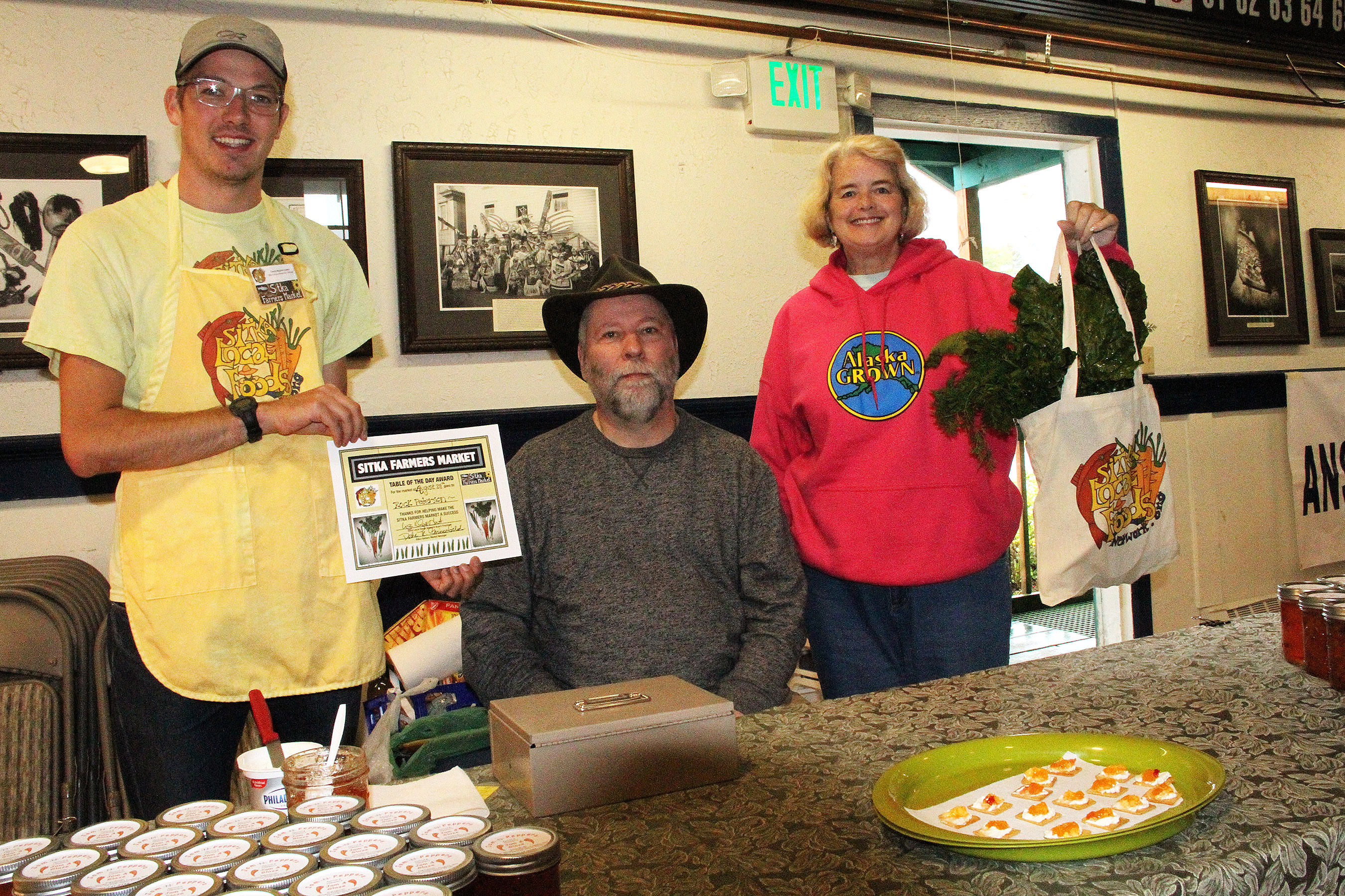 Sitka Farmers Market Assistant Manager Francis Wegman-Lawless, left, and Sitka Farmers Market Manager Debe Brincefield, right, present the Table Of The Day Award to Rock Peterson of Jam-N-Peppers at the fifth Sitka Farmers Market of the 2015 summer on Saturday, Aug. 29, at the Alaska Native Brotherhood Founders Hall in Sitka. Peterson sells an apricot and pepper jam/glaze. He received a gift bag with fresh chard, kale, beets, and other veggies. The market also featured the inaugural Sitka Slug Races, won by Linda Wilson’s slug Moses, with Sophie Nethercut and Maybelle Filler’s slug Thug The Slug second, and Thomas Witherspoon’s slug Slugzilla third. This is the eighth year of Sitka Farmers Markets, hosted by the Sitka Local Foods Network. The last market of the summer is from 10 a.m. to 1 p.m. on Saturday, Sept. 12, at the Alaska Native Brotherhood Founders Hall, 235 Katlian St. For more information about the Sitka Farmers Markets and Sitka Local Foods Network, go to http://www.sitkalocalfoodsnetwork.org/, check out our Facebook page at https://www.facebook.com/SitkaLocalFoodsNetwork, or follow us on Twitter at https://www.twitter.com/SitkaLocalFoods. (PHOTO COURTESY OF SITKA LOCAL FOODS NETWORK)