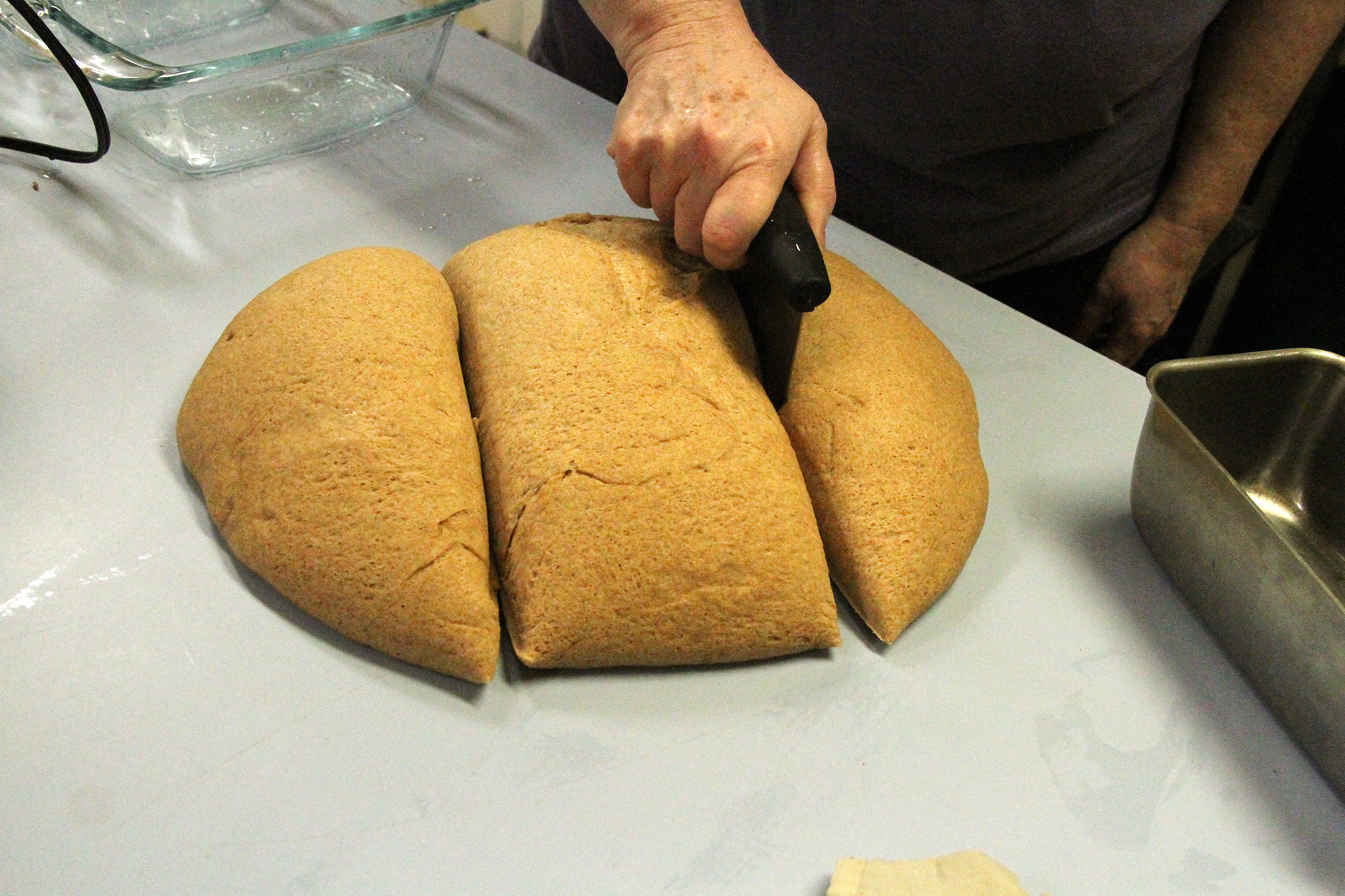 CuttingBreadDoughIntoBreadPanPortions Published November 3, 2015 at 2700 × 1800 in • Scenes from the second class in the Sitka Kitch’s Cooking From Scratch series — Baking Whole-Grain Bread ← Previous Next →