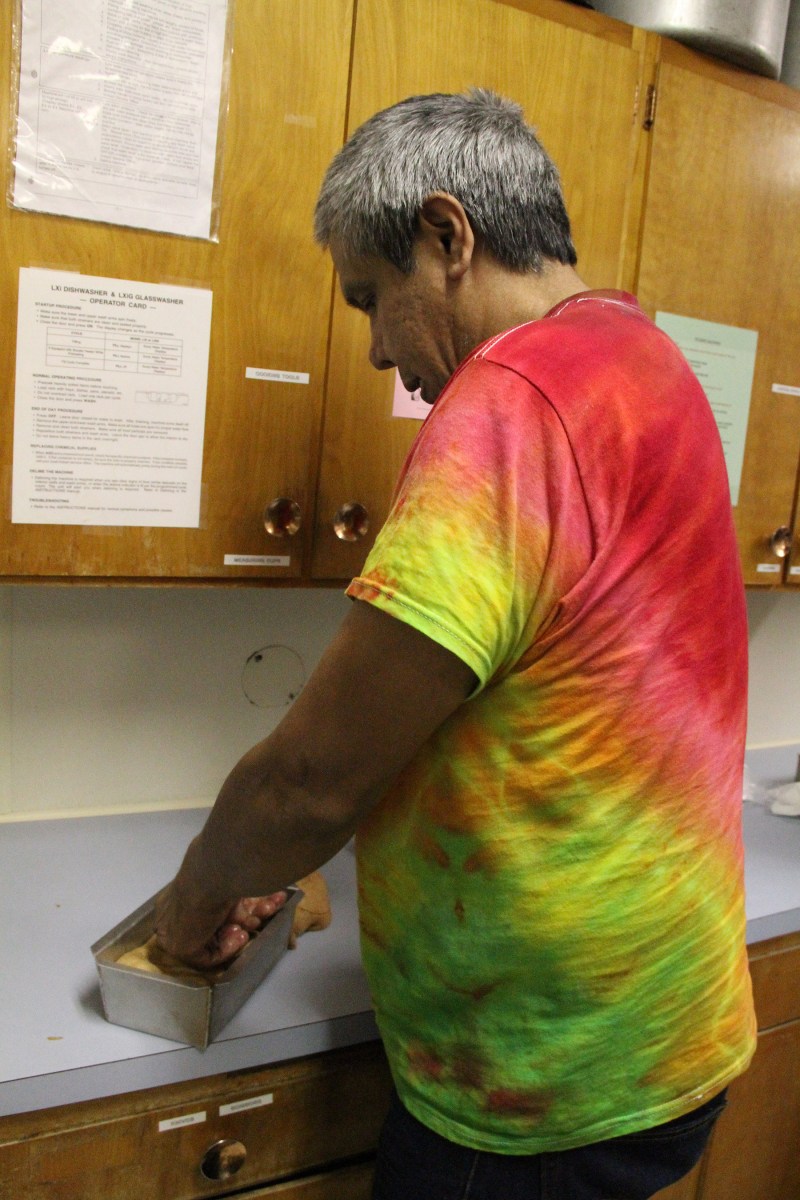 RobertBainesPunchesBreadInPan Published November 3, 2015 at 1800 × 2700 in • Scenes from the second class in the Sitka Kitch’s Cooking From Scratch series — Baking Whole-Grain Bread ← Previous Next →