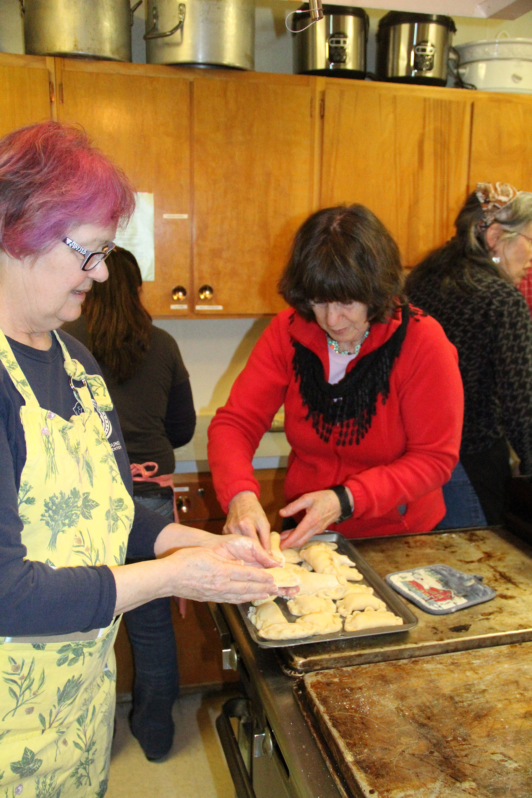 YvonneAndMaryToddPutCheeseEmpanadasOnTray Published March 1, 2016 at 1800 × 2700 in Scenes from the last Winter Cooking From Scratch series class at the Sitka Kitch — Homemade Empanadas ← Previous Next →