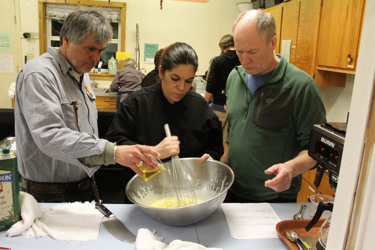 BarbaraShowsErnieAndPatHowToWhiskToEmulsifyEggs Published March 16, 2016 at 2700 × 1800 in Scenes from the second Basic Culinary Skills class at the Sitka Kitch ← Previous Next →