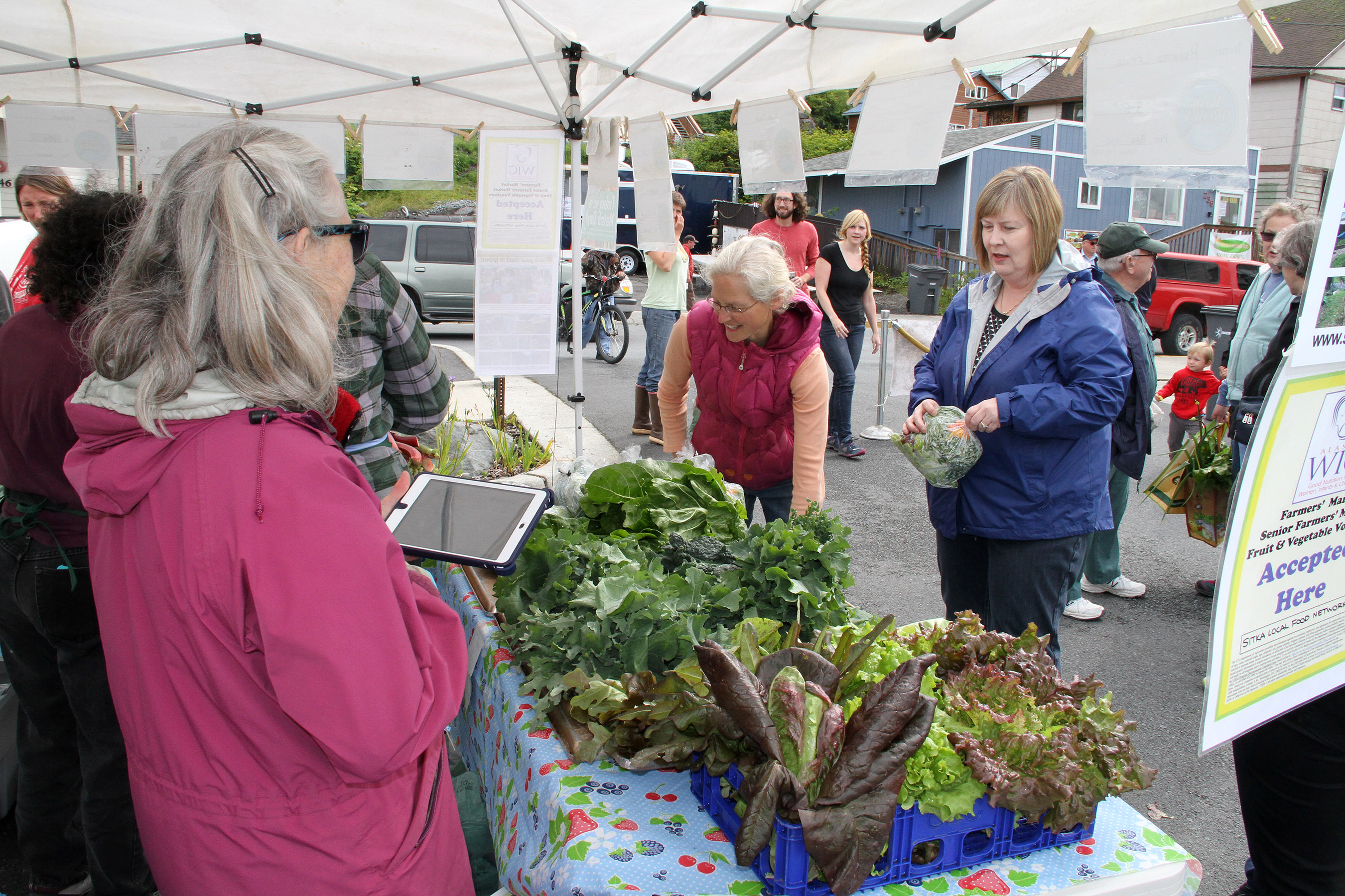 SLFNBoothLisaSadleirHartReadyForSaleAsLauraSchmidtAddsLettuceToTable Published July 3, 2016 at 2700 × 1800 in Scenes from the first Sitka Farmers Market of the 2016 summer ← Previous Next →