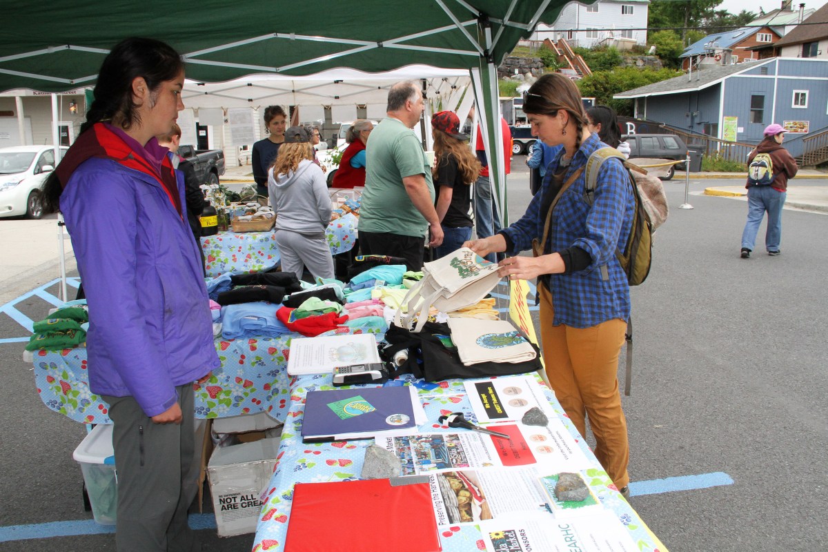 SLFNSwagBoothClaireChangWatchesAsCustomerChecksOutToteBag Published July 17, 2016 at 2700 × 1800 in Scenes from the second Sitka Farmers Market of the 2016 summer ← Previous Next →