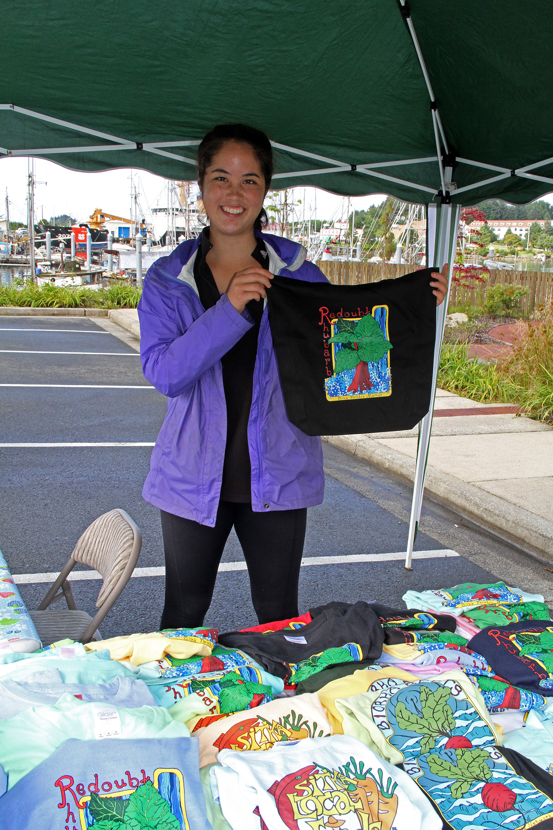 SLFNSwagBoothClaireChangWithToteBag Published July 31, 2016 at 1800 × 2700 in Scenes from the third Sitka Farmers Market of the 2016 summer ← Previous Next →