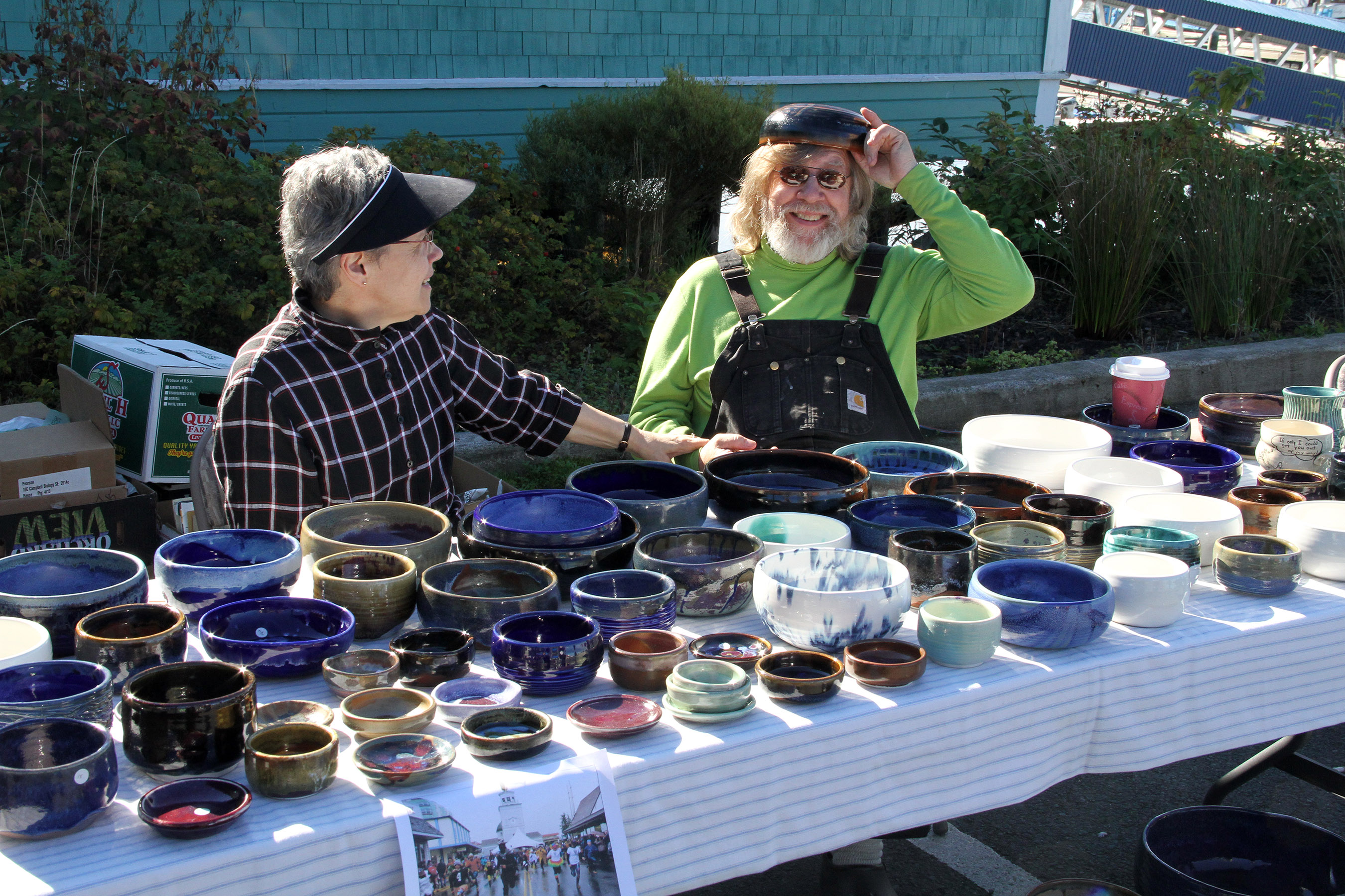 LucyPhillipsPotteryLooksAtRitchPhillipsWithBowlOverHead Published September 5, 2016 at 2700 × 1800 in Scenes from the sixth Sitka Farmers Market of the 2016 summer ← Previous Next →