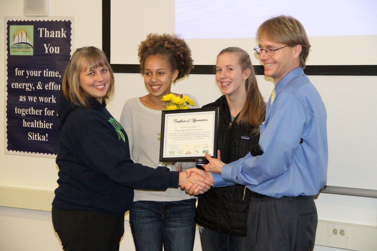 dougosbornepresentsawardtogirlscouttroop4140 Published October 23, 2016 at 2700 × 1800 in Sitka Health Summit chooses two community wellness projects related to local food ← Previous Next →