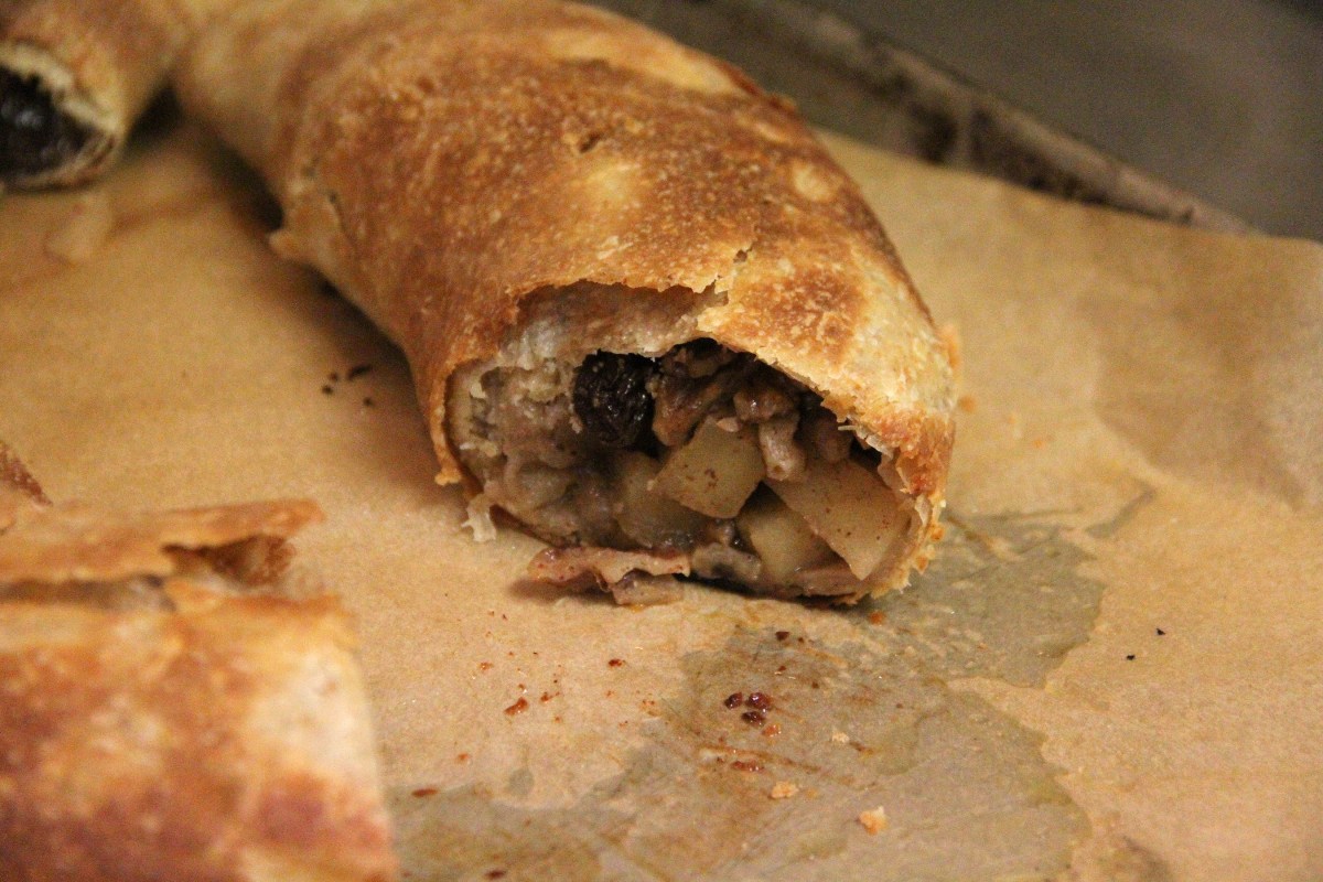 CrossSectionOfAppleRaisinNutStrudel Published April 14, 2017 at 2700 × 1800 in Scenes from the Sitka Kitch’s Cooking Around The World series class on Austrian strudel Next →