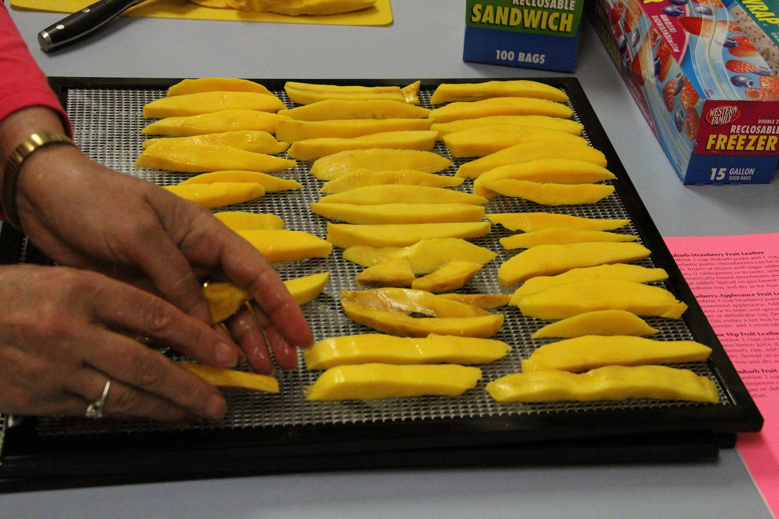 LisaMFillsTrayWithMango Published June 13, 2017 at 2700 × 1800 in Scenes from the Sitka Kitch’s Preserving the Harvest series class on food dehydration ← Previous Next →
