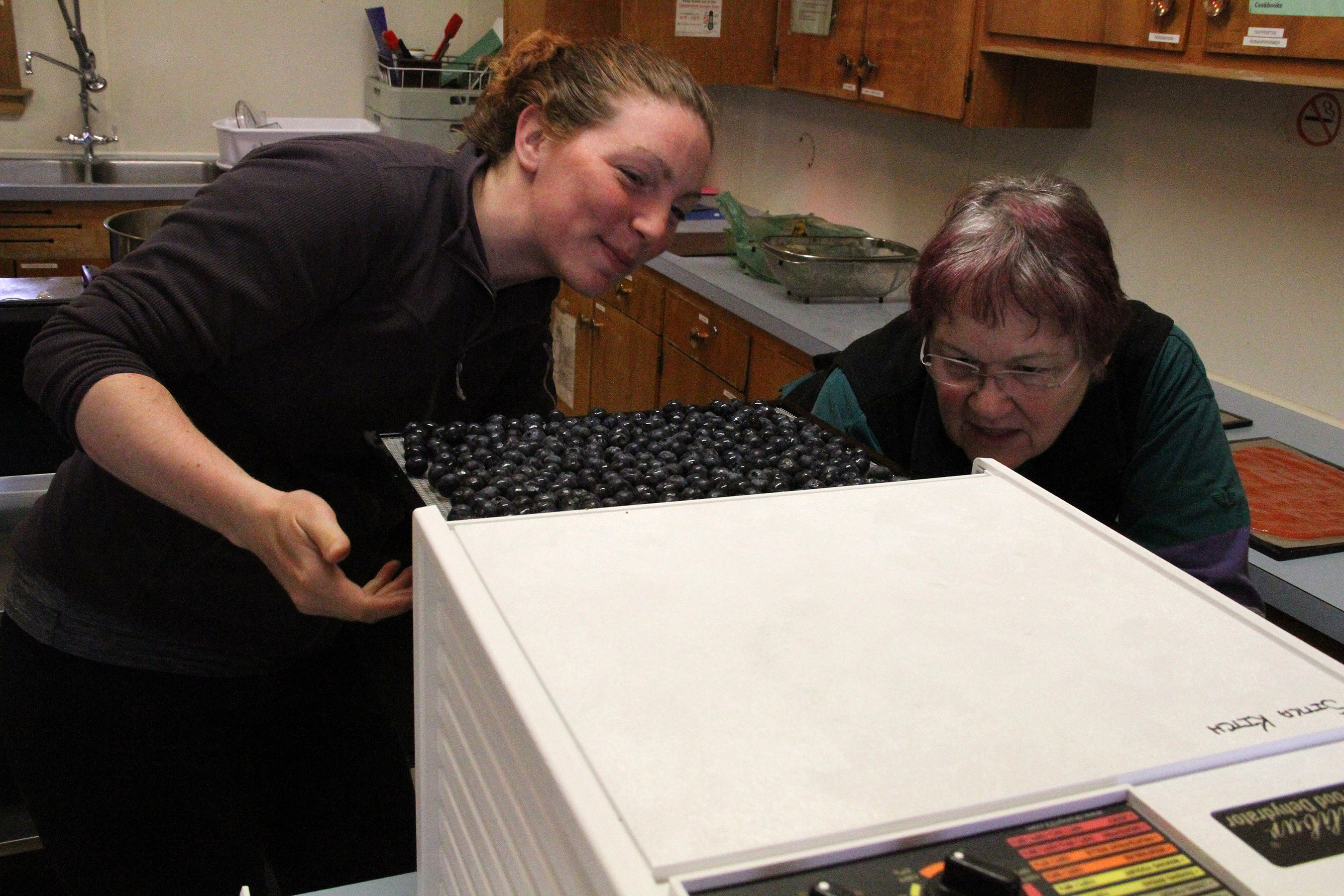 RebaAndYvonneTryToFitBlueberryTrayIntoDryer Published June 13, 2017 at 2700 × 1800 in Scenes from the Sitka Kitch’s Preserving the Harvest series class on food dehydration ← Previous Next →
