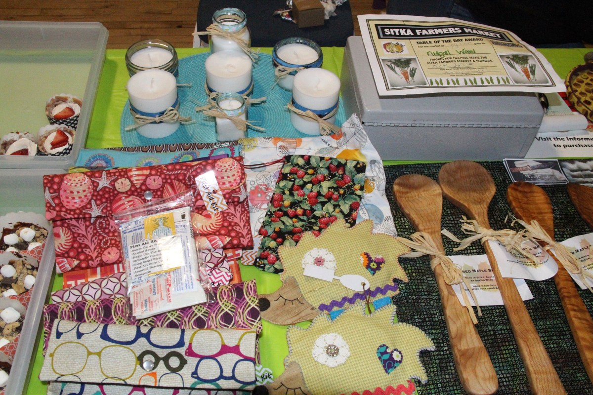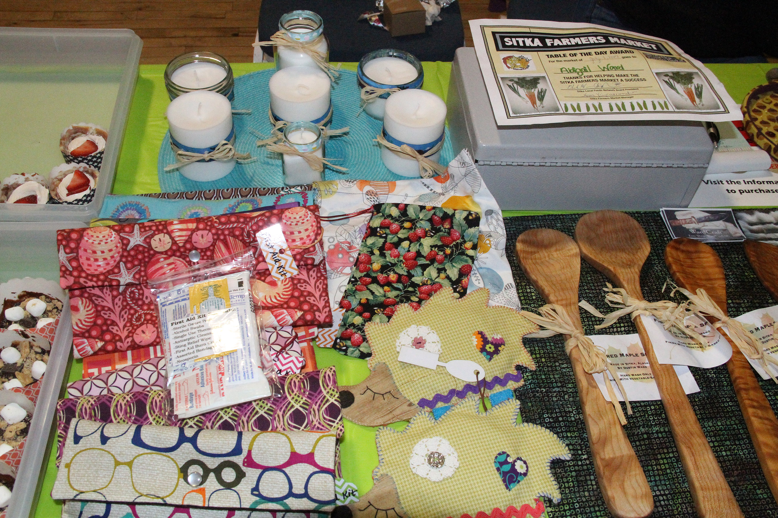 AbigailWardBoothProductsBakedGoodsCandlesFirstAidPouchesWoodenSpoons Published July 2, 2017 at 2700 × 1800 in Scenes from the first Sitka Farmers Market of the 2017 summer season ← Previous Next →