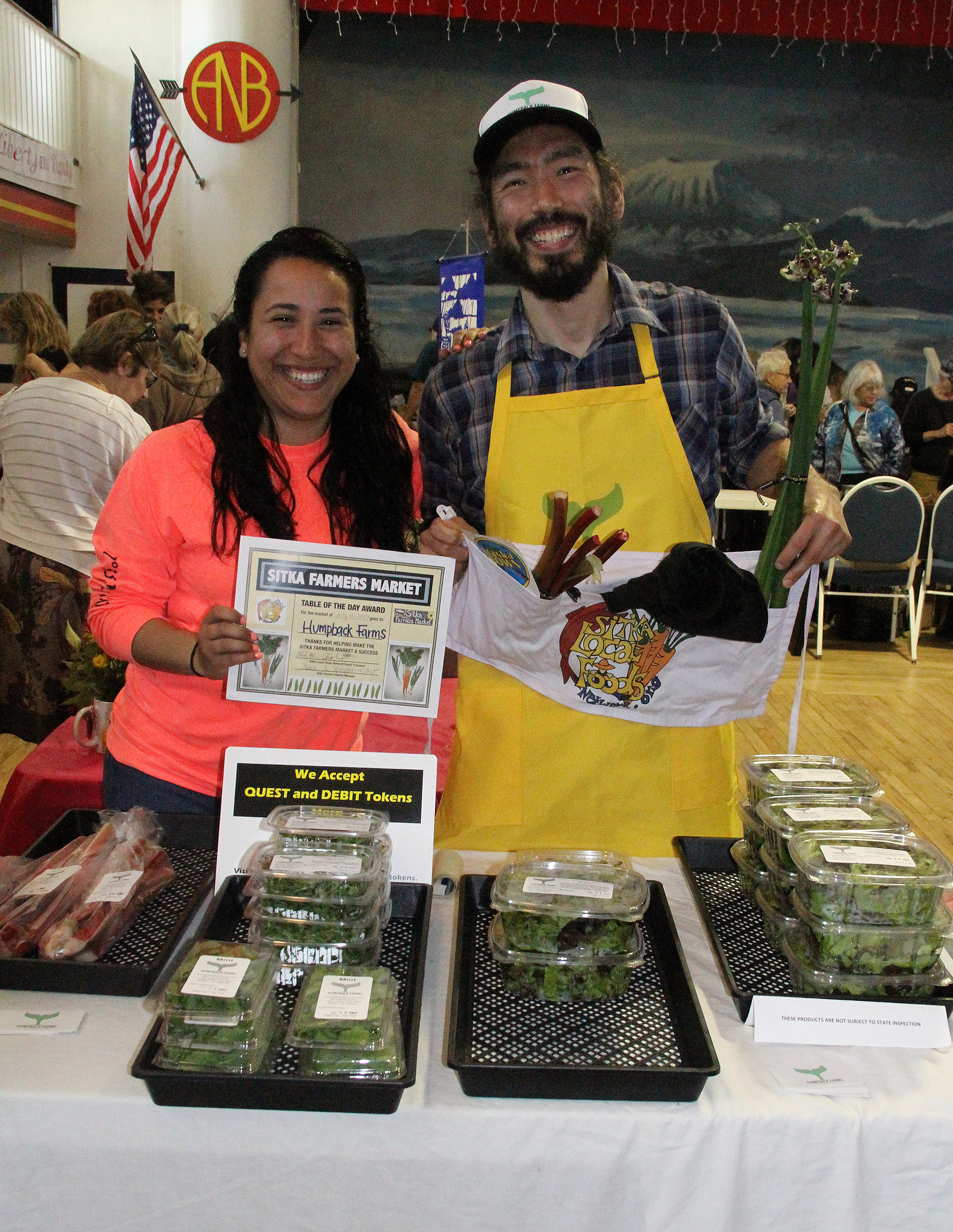 Sitka Farmers Market manager Nina Vizcarrondo, left, presents the Table of the Day award to Peter Williams of Humpback Farms. Peter sold lettuce, salad mixes, micro-greens and rhubarb. He received a Sitka Local Foods Network apron, a Biorka Beets t-shirt, some walking onions and some rhubarb.