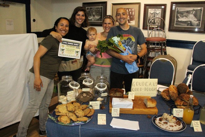 Table of the Day: Sitka Farmers Market manager Nina Vizcarrondo, left, and Sitka Local Foods Network Bulldog On Baranof intern Al Simon, second from left, present the Table of the Day award to Ariane Martin Goudeau (holding baby Elodie Goudeau) and Geoffrey Goudeau of Goudeau’s Good-Doughs during the fourth Sitka Farmers Market of the 2017 summer, held Saturday, Aug. 12, at the Alaska Native Brotherhood Founders Hall. Ariane and Geoffrey sold cookies, bread, and a variety of other baked goods. They received a Sitka Local Foods Network apron loaded with some rhubarb, beets, a Sitka Local Foods Network t-shirt, and an Alaska Grown sticker.