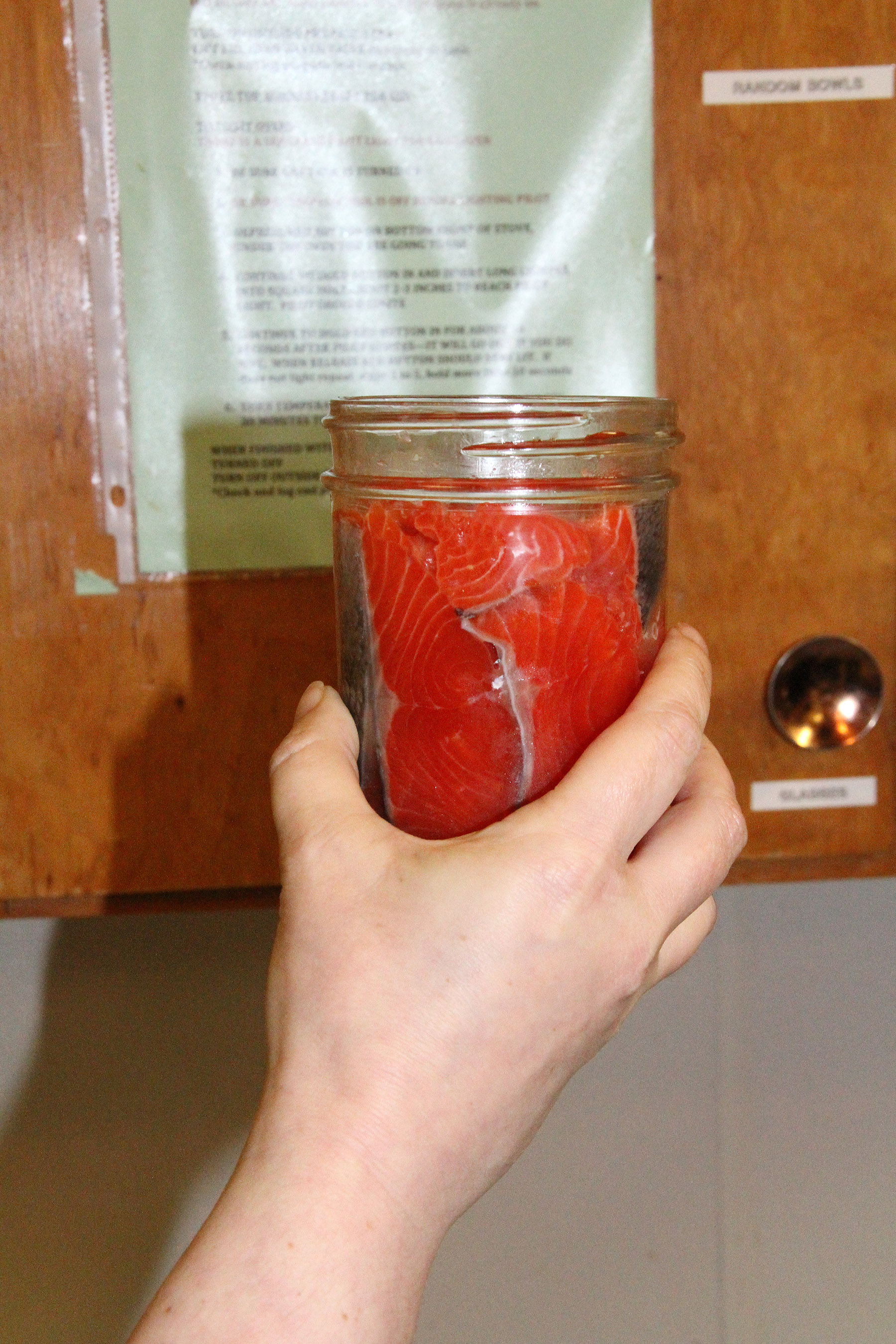 ChristinaHoldsUpJarOfSalmon Published August 18, 2017 at 1800 × 2700 in Scenes from the Sitka Kitch classes on filleting and canning salmon for the Sitka Seafood Festival ← Previous Next →