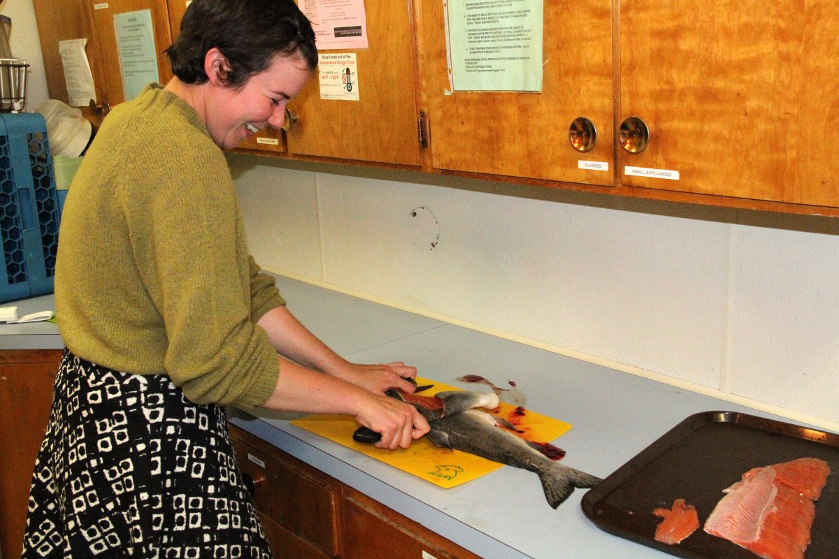 ClaireFilletsSalmon Published August 18, 2017 at 2700 × 1800 in Scenes from the Sitka Kitch classes on filleting and canning salmon for the Sitka Seafood Festival ← Previous Next →