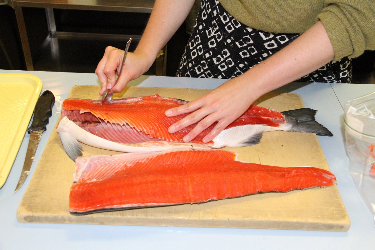 ClaireScoopsOutSockeyeBurgerMeat Published August 18, 2017 at 2700 × 1800 in Scenes from the Sitka Kitch classes on filleting and canning salmon for the Sitka Seafood Festival ← Previous Next →