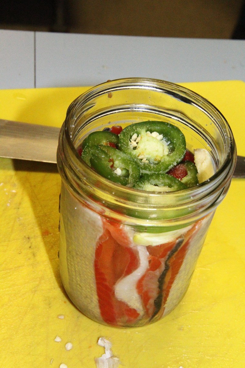JarOfSalmonWithJalopenosAndGarlic Published August 18, 2017 at 1800 × 2700 in Scenes from the Sitka Kitch classes on filleting and canning salmon for the Sitka Seafood Festival ← Previous Next →