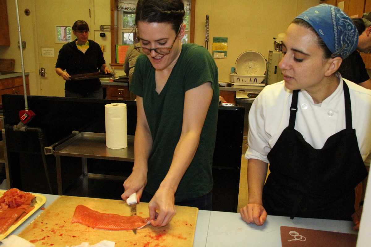 KatherineSkinsSalmonFilletAsReneeJakaitisWatches Published August 18, 2017 at 2700 × 1800 in Scenes from the Sitka Kitch classes on filleting and canning salmon for the Sitka Seafood Festival ← Previous Next →