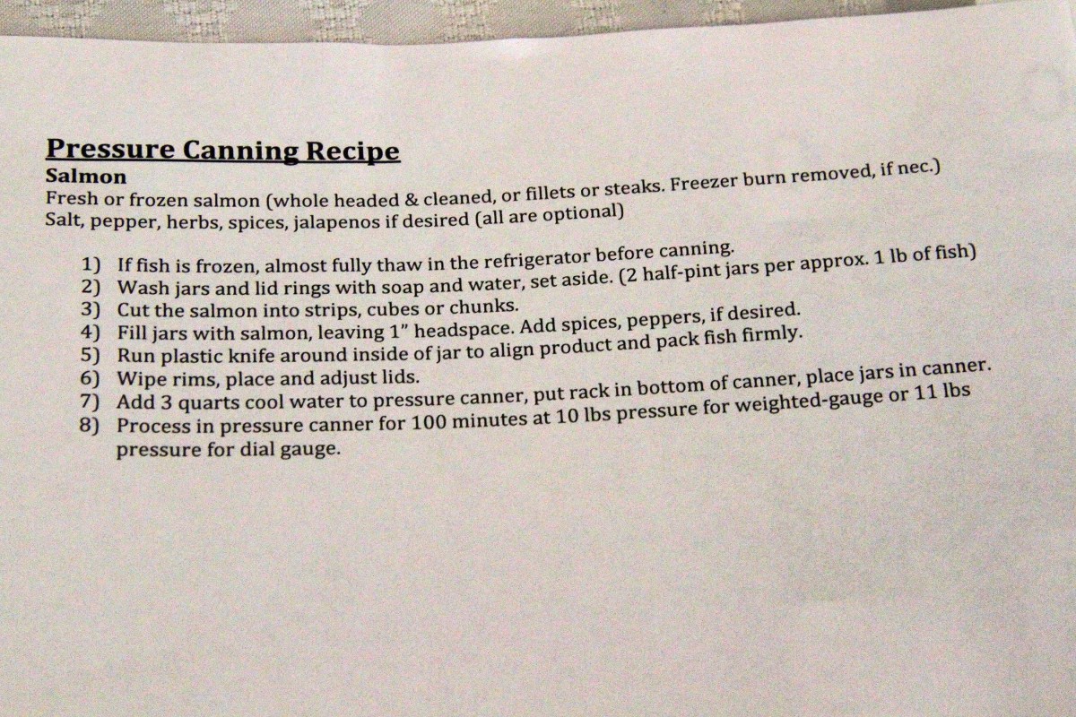 PressureCanningRecipeForSalmon Published August 18, 2017 at 2700 × 1800 in Scenes from the Sitka Kitch classes on filleting and canning salmon for the Sitka Seafood Festival ← Previous Next →