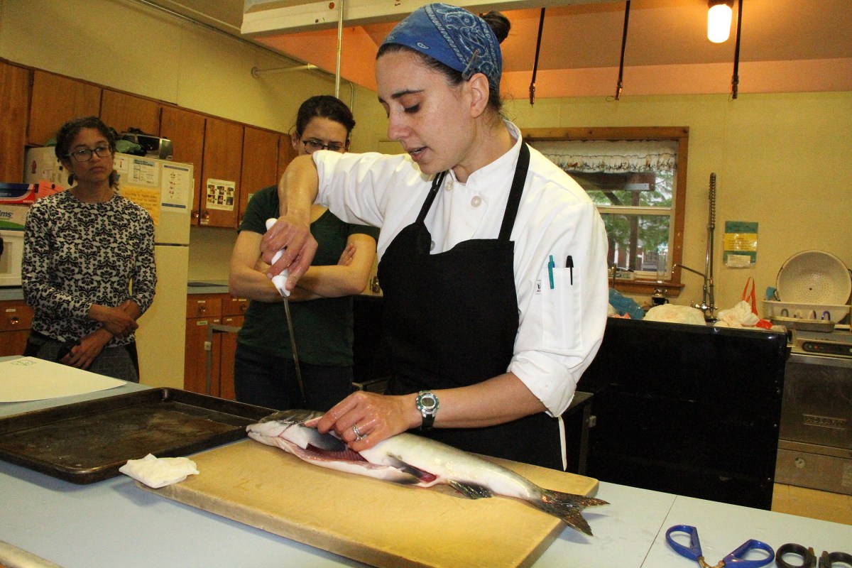 ReneeJakaitisMakesFirstCutBehindFin Published August 18, 2017 at 2700 × 1800 in Scenes from the Sitka Kitch classes on filleting and canning salmon for the Sitka Seafood Festival ← Previous Next →