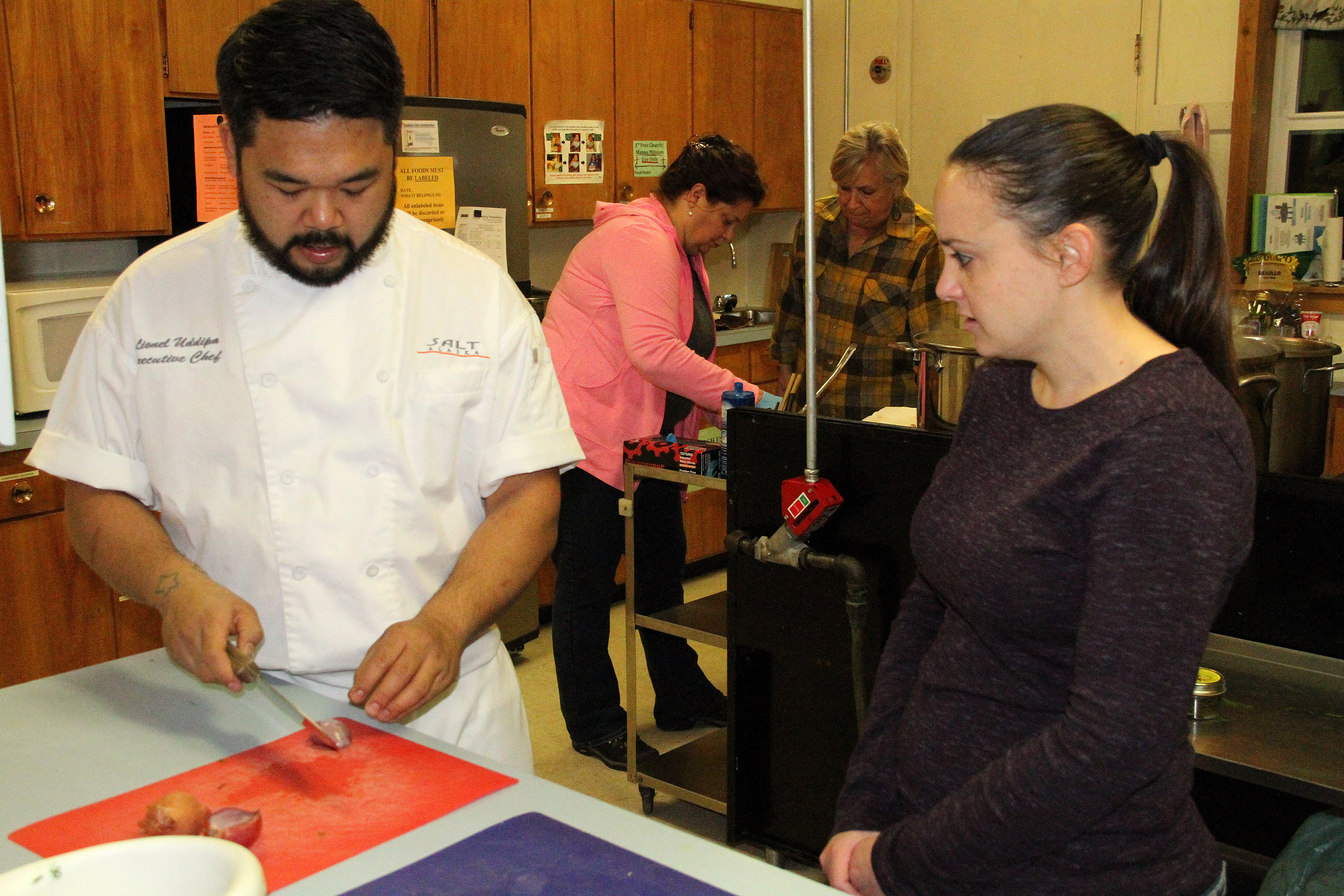 ChefLionelUddipaShowsJenniferHowToChopScallions Published November 8, 2017 at 2700 × 1800 in Scenes from the Cooking From Scratch class on Fish ‘n Veggies at the Sitka Kitch ← Previous Next →