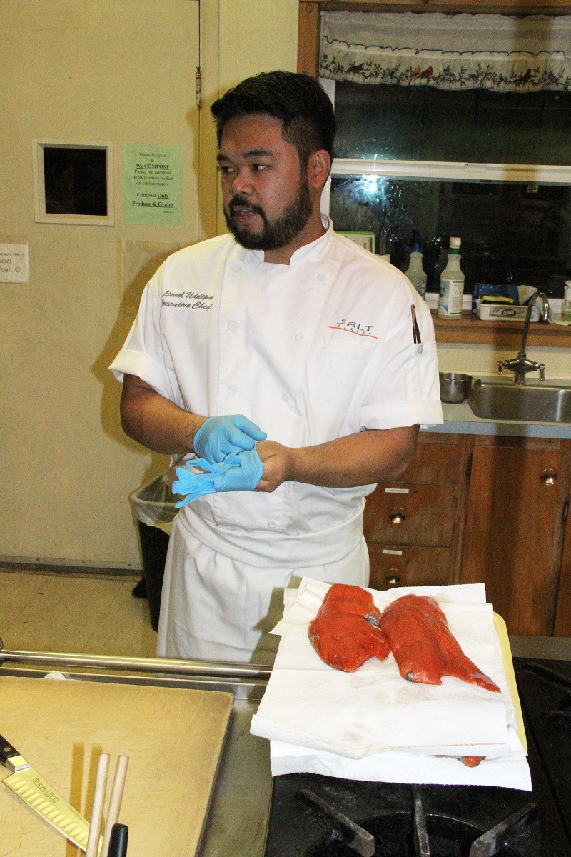 ChefLionelUddipaWithCohoSalmon Published November 8, 2017 at 1800 × 2700 in Scenes from the Cooking From Scratch class on Fish ‘n Veggies at the Sitka Kitch ← Previous Next →