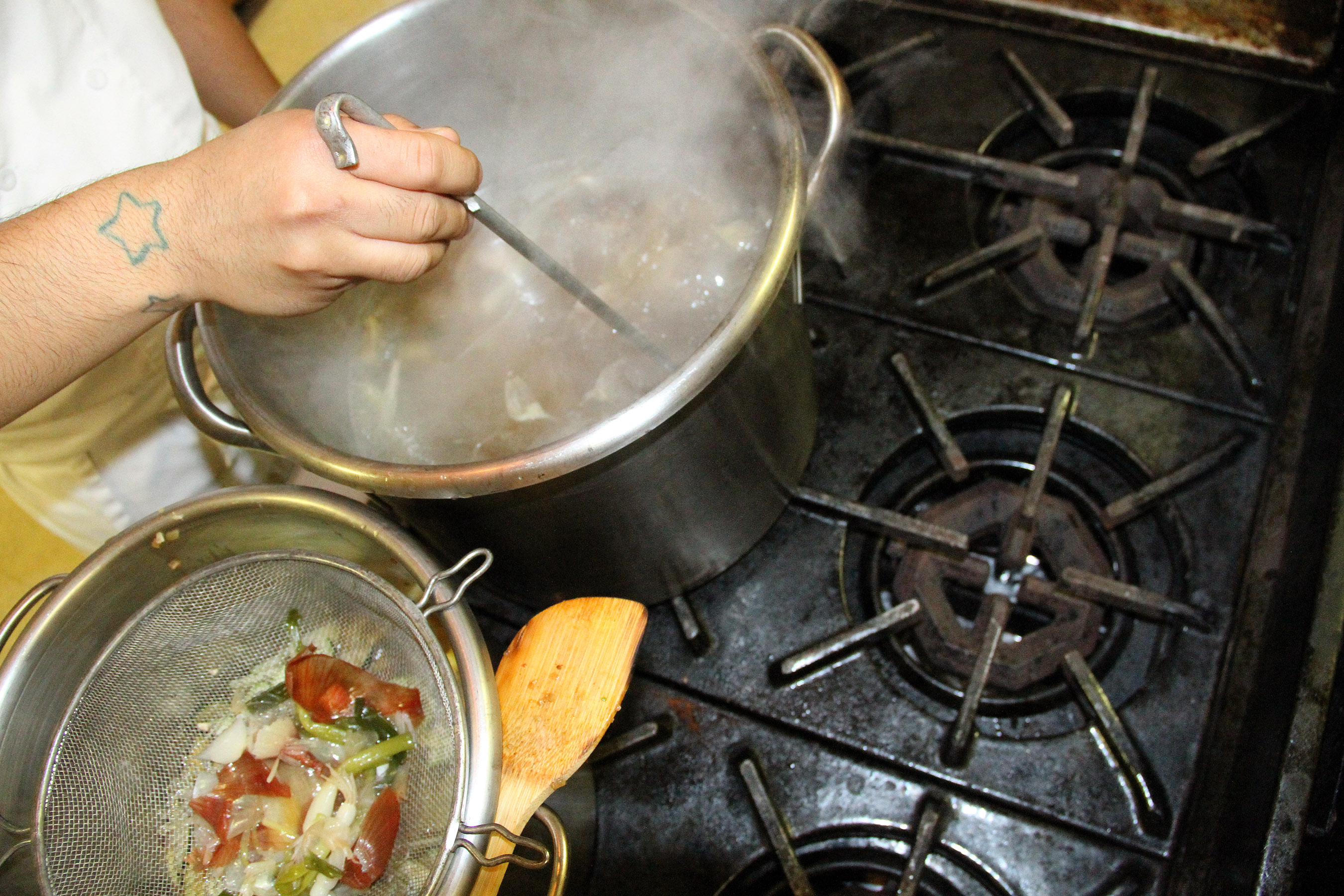 FromAboveChefLionelUddipaStrainsChickenStockLiquidIntoVeggiePan Published November 8, 2017 at 2700 × 1800 in Scenes from the Cooking From Scratch class on Fish ‘n Veggies at the Sitka Kitch ← Previous Next →