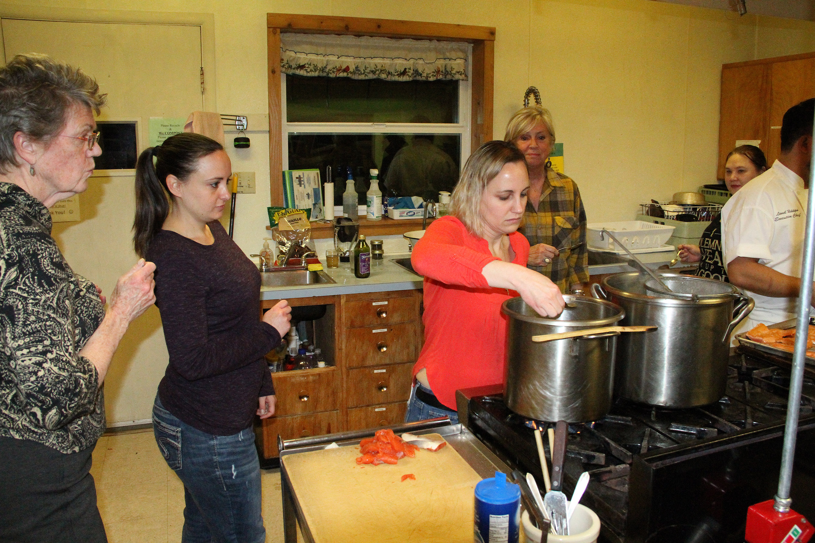 KimeAndOtherStudentsGetATastingSpoonOfStockLiquidOnVeggies Published November 8, 2017 at 2700 × 1800 in Scenes from the Cooking From Scratch class on Fish ‘n Veggies at the Sitka Kitch ← Previous Next →