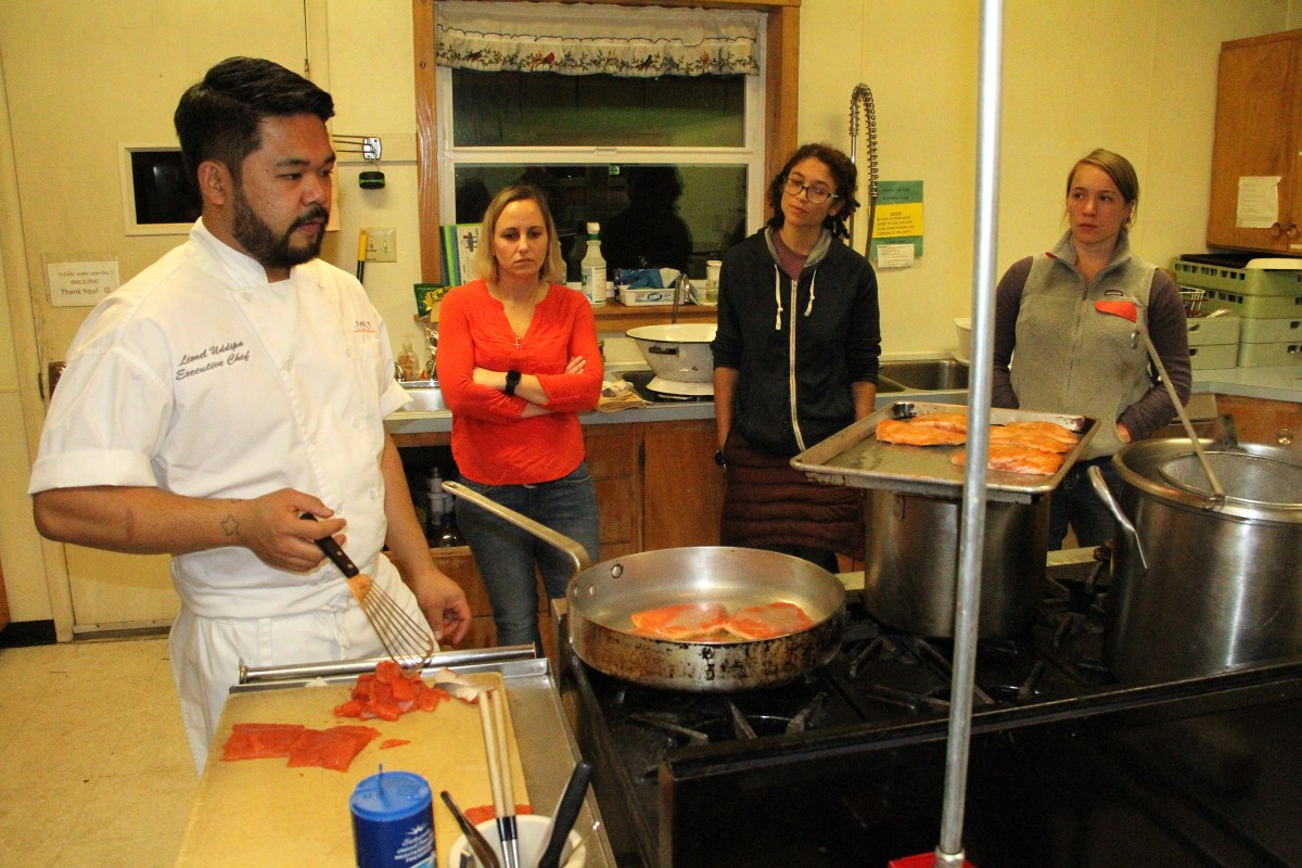 StudentsWatchAsChefLionelUddipaSearsCohoSalmon Published November 8, 2017 at 2700 × 1800 in Scenes from the Cooking From Scratch class on Fish ‘n Veggies at the Sitka Kitch ← Previous Next →