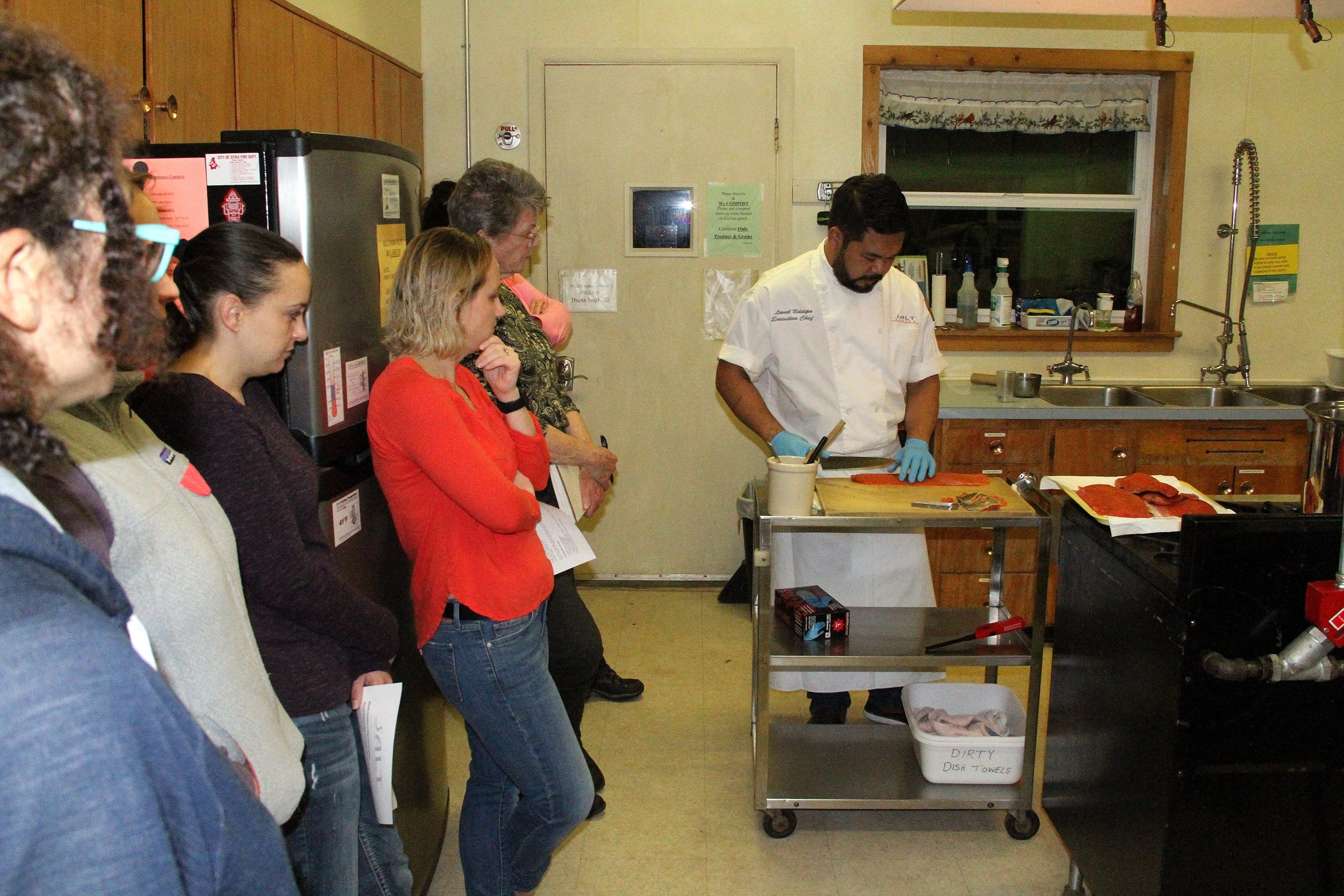 StudentsWatchChefLionelUddipaPrepareSalmonForCooking Published November 8, 2017 at 2700 × 1800 in Scenes from the Cooking From Scratch class on Fish ‘n Veggies at the Sitka Kitch ← Previous Next →