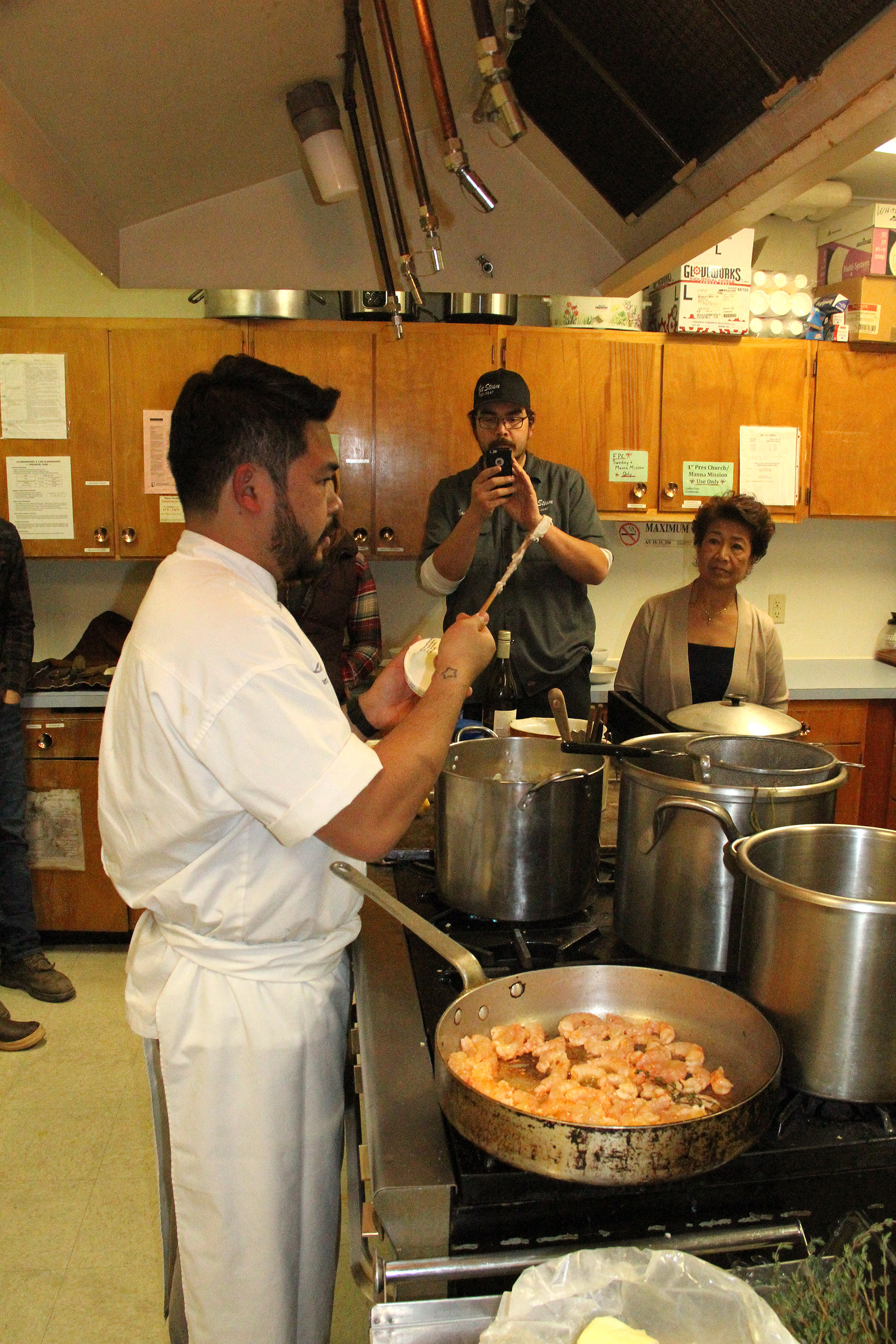 ChefLionelUddipaChecksRisottoWhileSpotPrawnsCook Published November 10, 2017 at 1800 × 2700 in Scenes from the Cooking From Scratch Great American Seafood Cook-Off demonstration at the Sitka Kitch ← Previous Next →