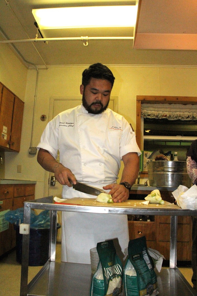ChefLionelUddipaChopsFennelBulb Published November 10, 2017 at 1800 × 2700 in Scenes from the Cooking From Scratch Great American Seafood Cook-Off demonstration at the Sitka Kitch ← Previous Next →