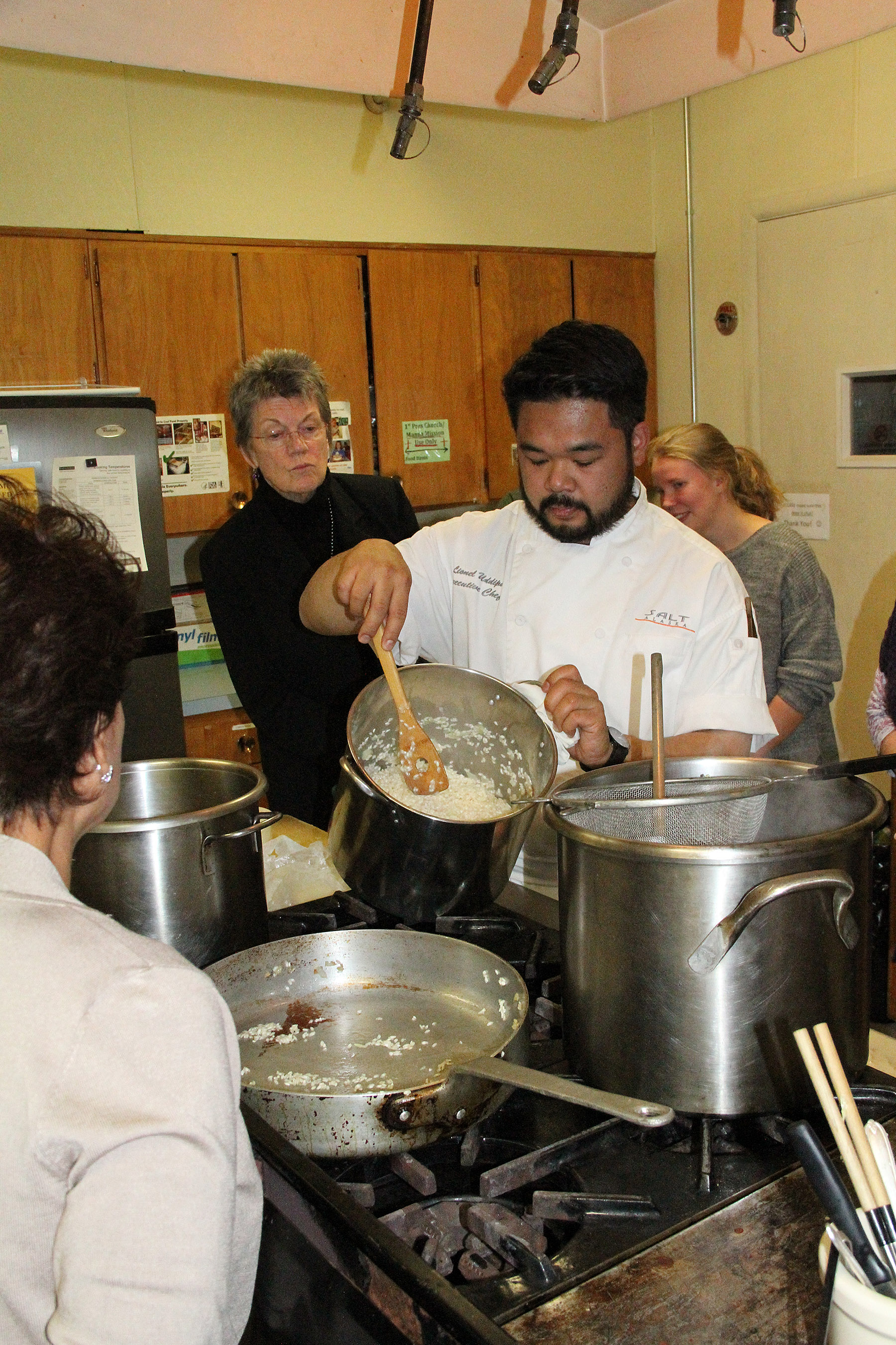 ChefLionelUddipaShowsStudentsTextureOfRisotto Published November 10, 2017 at 1800 × 2700 in Scenes from the Cooking From Scratch Great American Seafood Cook-Off demonstration at the Sitka Kitch ← Previous Next →