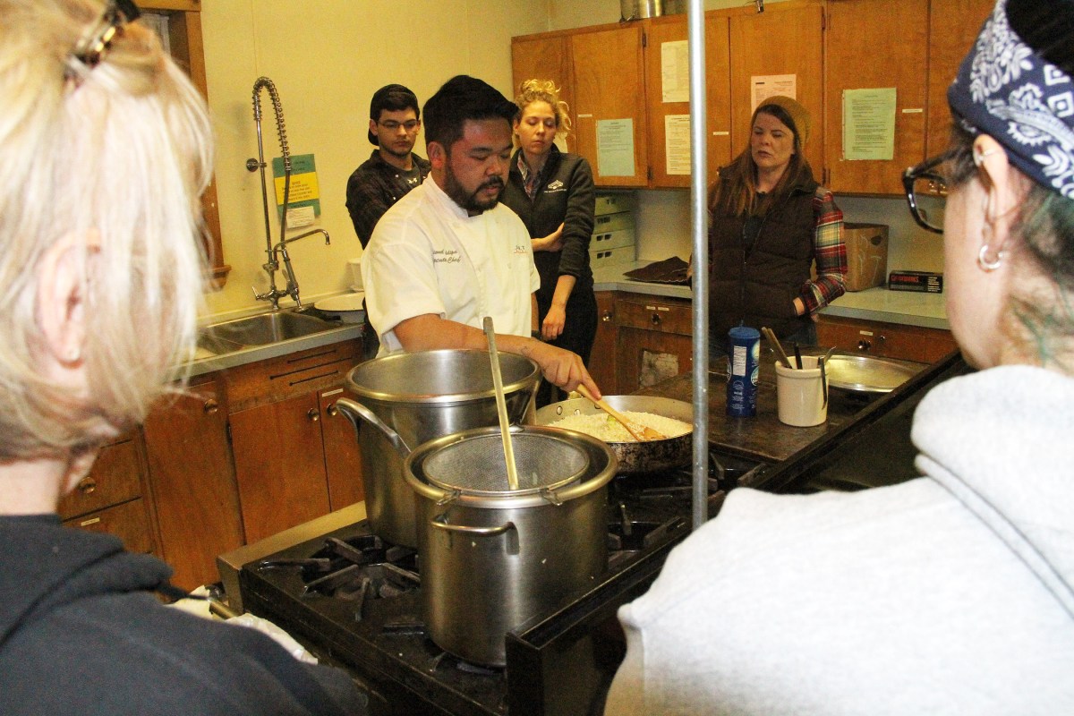 StudentsWatchChefLionelUddipaCookRIce Published November 10, 2017 at 2700 × 1800 in Scenes from the Cooking From Scratch Great American Seafood Cook-Off demonstration at the Sitka Kitch ← Previous Next →