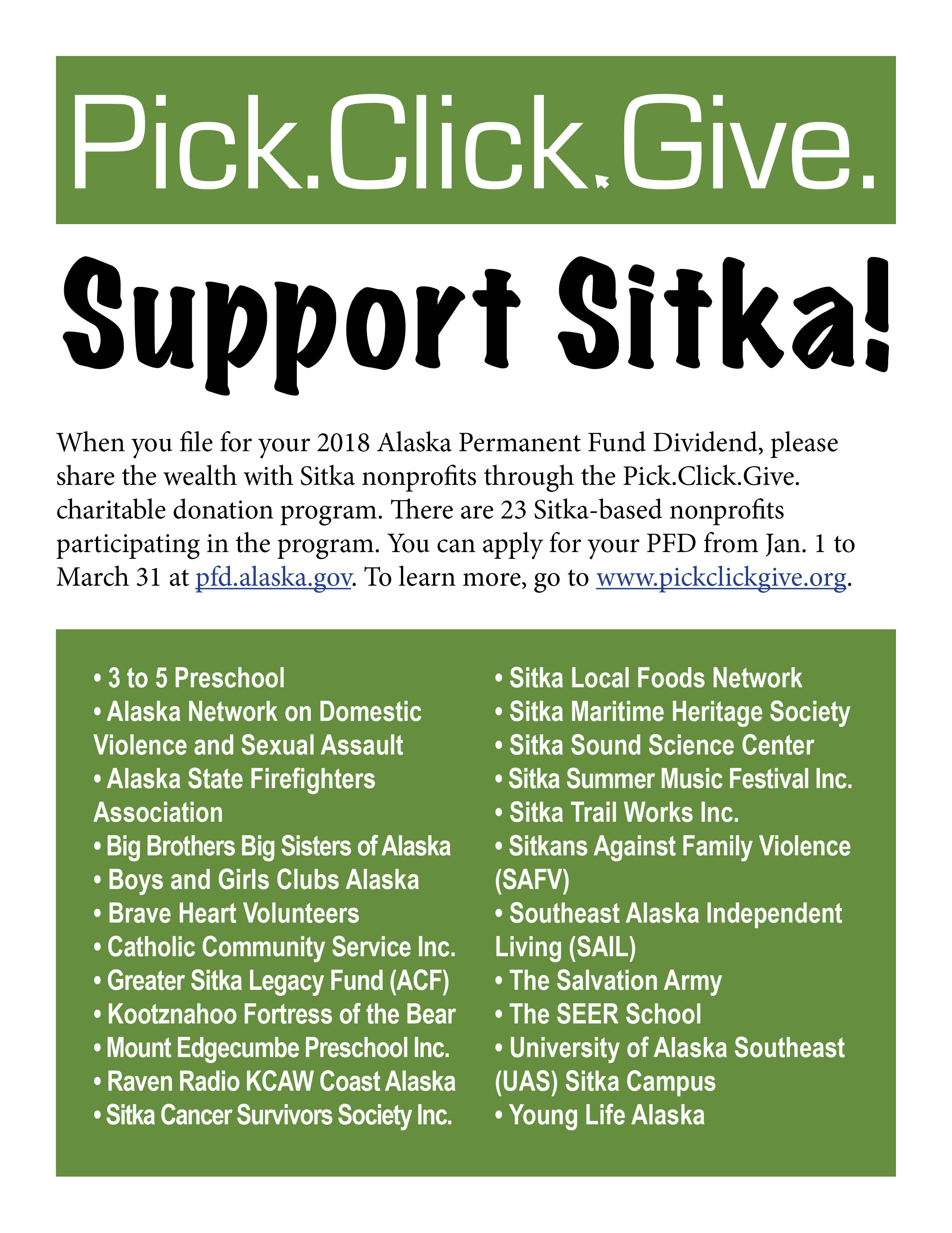 SupportSitkaFlier Published December 28, 2017 at 2550 × 3301 in Monday’s the day to start filing your PFD applications with Pick.Click.Give. donations ← Previous Next →