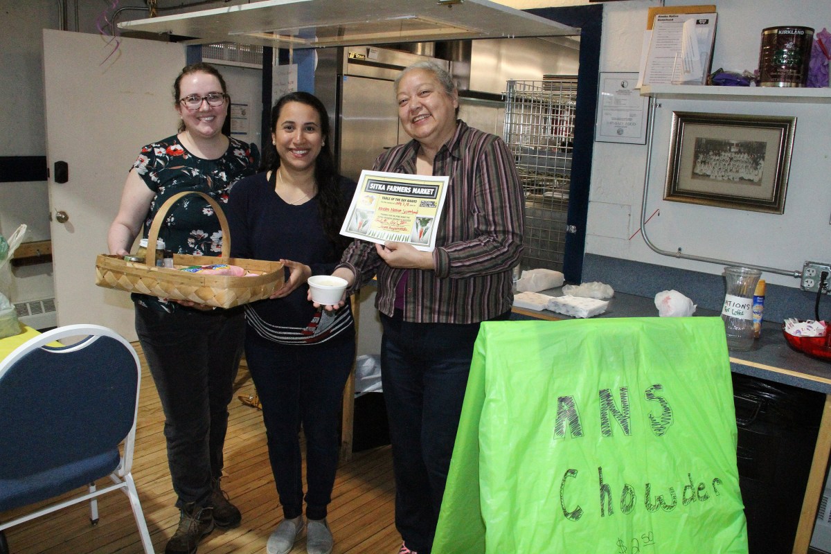 Sitka Farmers Market manager Nina Vizcarrondo, center, presents the Table of the Day Award to Rachel Henderson, left, and Liz Maric of the Alaska Native Sisterhood Camp 4 Clam Chowder Booth during the first market of the summer held Saturday, July 7, at the Alaska Native Brotherhood Founders Hall. ANS served bowls and cups of clam chowder with pilot bread or crackers. The next Sitka Farmers Market is scheduled for 10 a.m. to 1 p.m. on Saturday, July 21, at ANB Founders Hall (235 Katlian Street). To learn more about the Sitka Farmers Market and how to be a vendor, go to the Sitka Local Foods Network website, http://www.sitkalocalfoodsnetwork.org. We also have Facebook pages for the Sitka Local Foods Network and the Sitka Farmers Market.