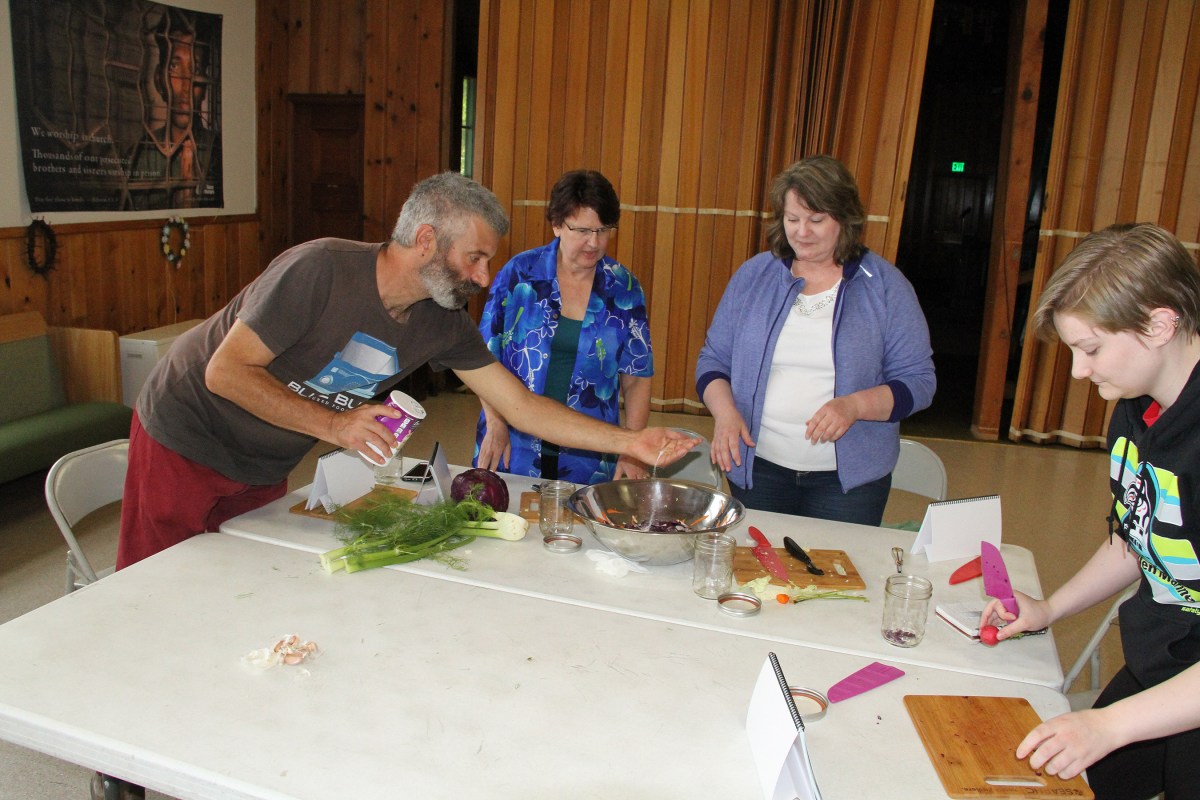 SandorKatzAddsSaltToBowlWithLisaSueDanikaChopVeggies Published July 10, 2018 at 2700 × 1800 in Scenes from the Fermentation Workshop With Sandor Katz held July 9 at the Sitka Kitch ← Previous Next →