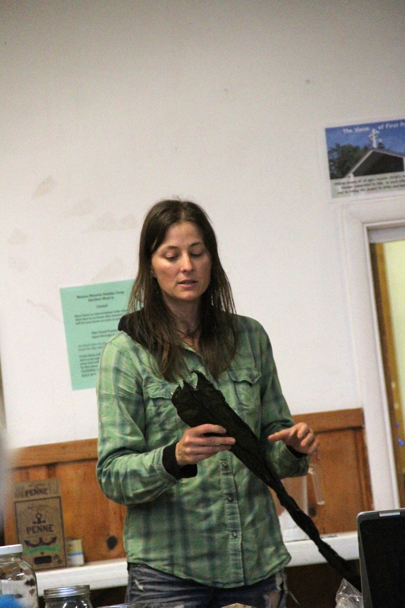 HopeMerrittDisplaysOneTypeOfSeaweed Published August 16, 2018 at 1800 × 2700 in Scenes from the Sitka Kitch cooking with seaweed class held in conjunction with the Sitka Mermaid Festival ← Previous Next →
